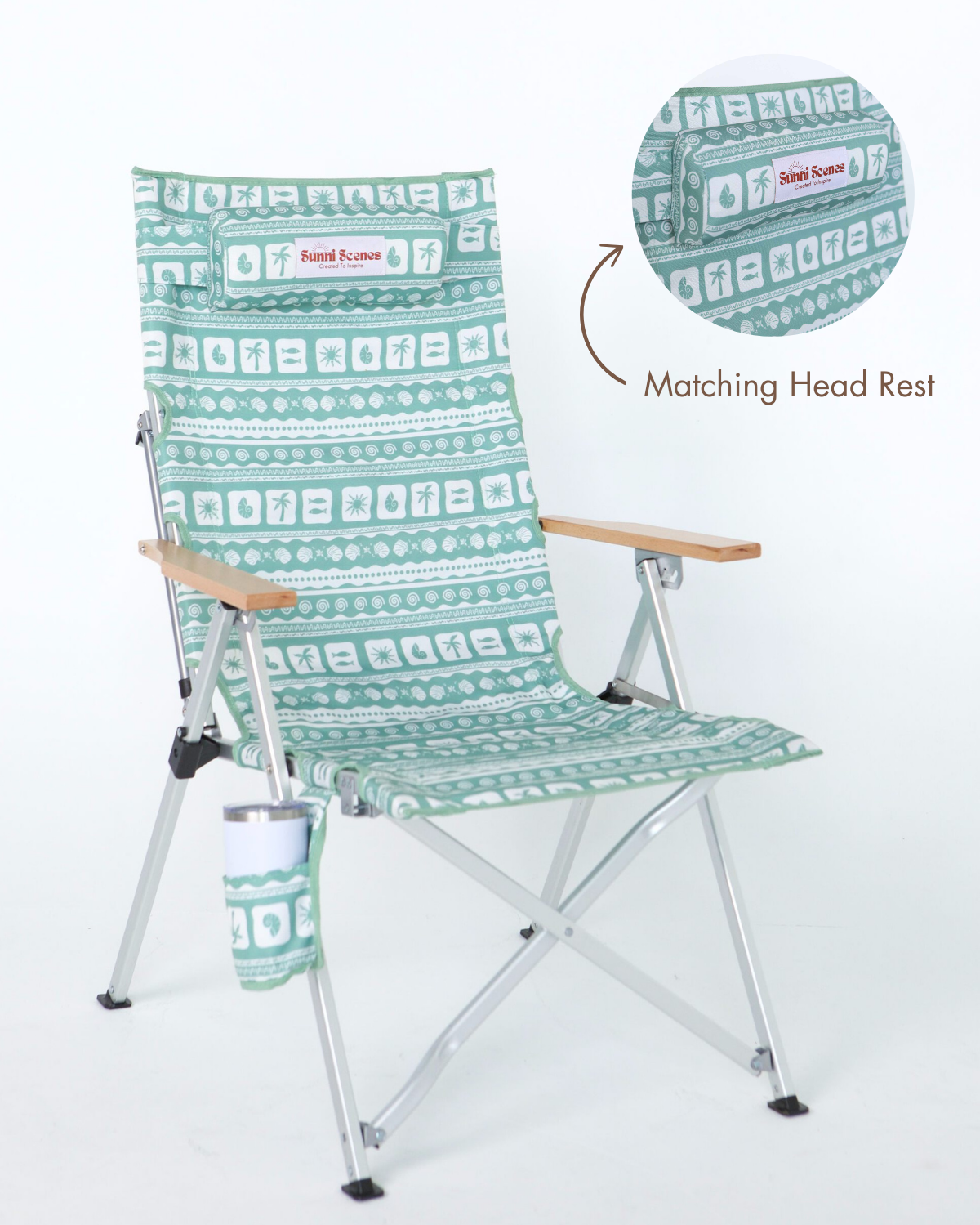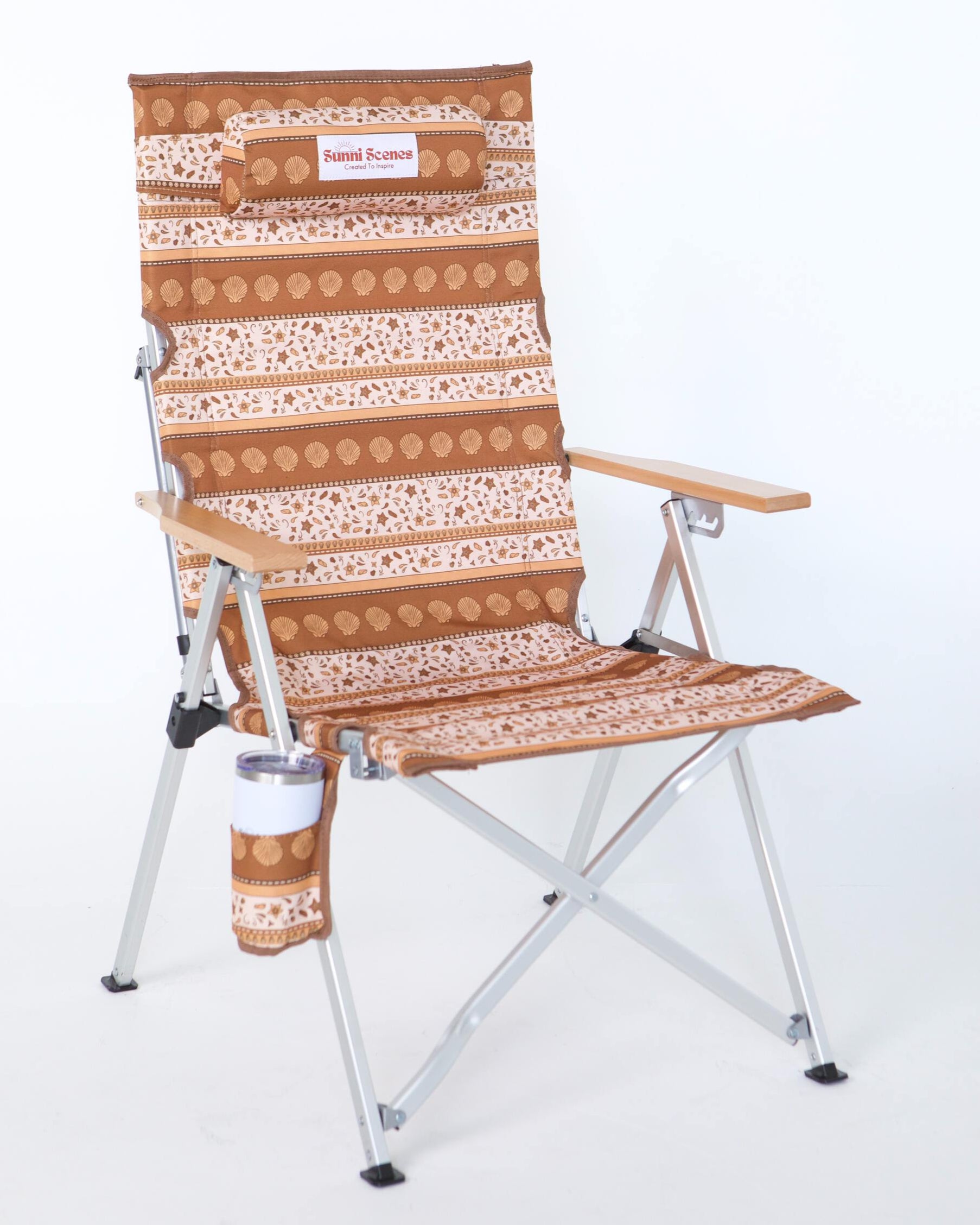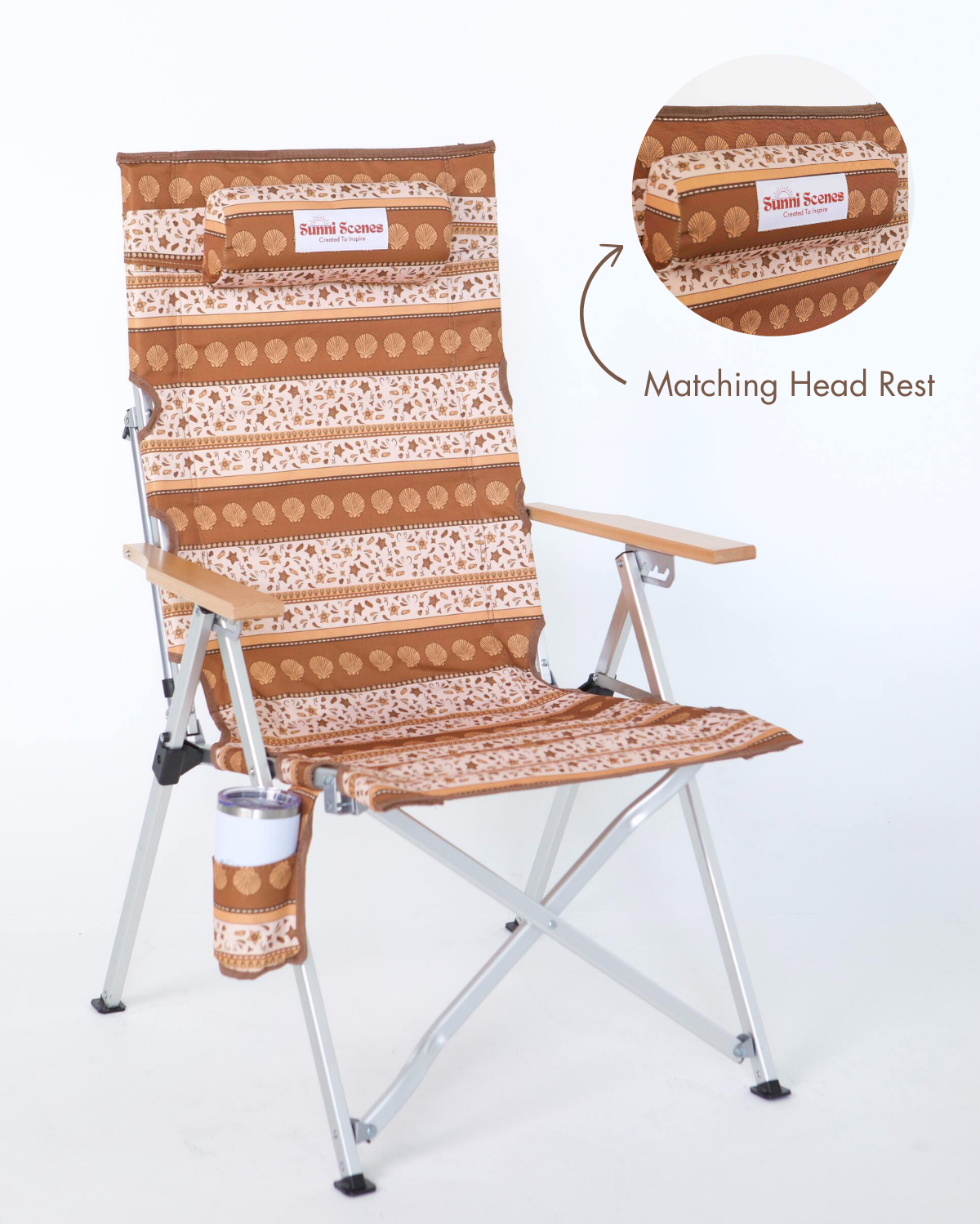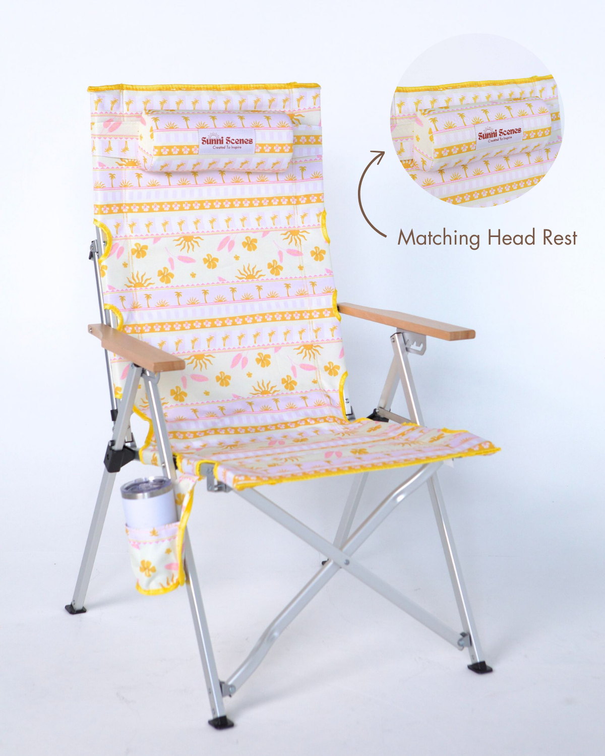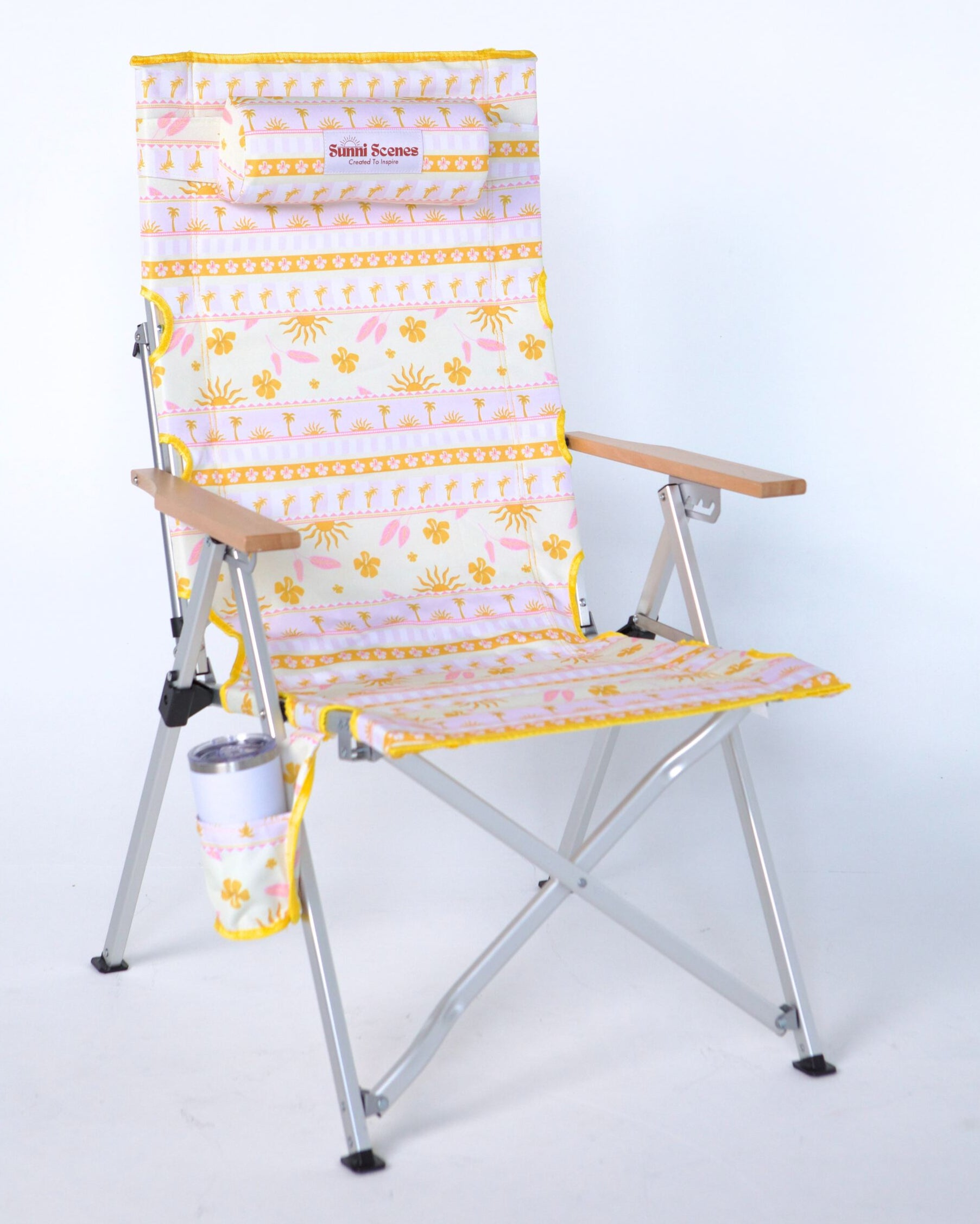 Unique Sunni Scenes prints, Four stage reclining, Removable matching head rest, Compact quad fold pack up design, Generously sized cup holder & Quick dry material.