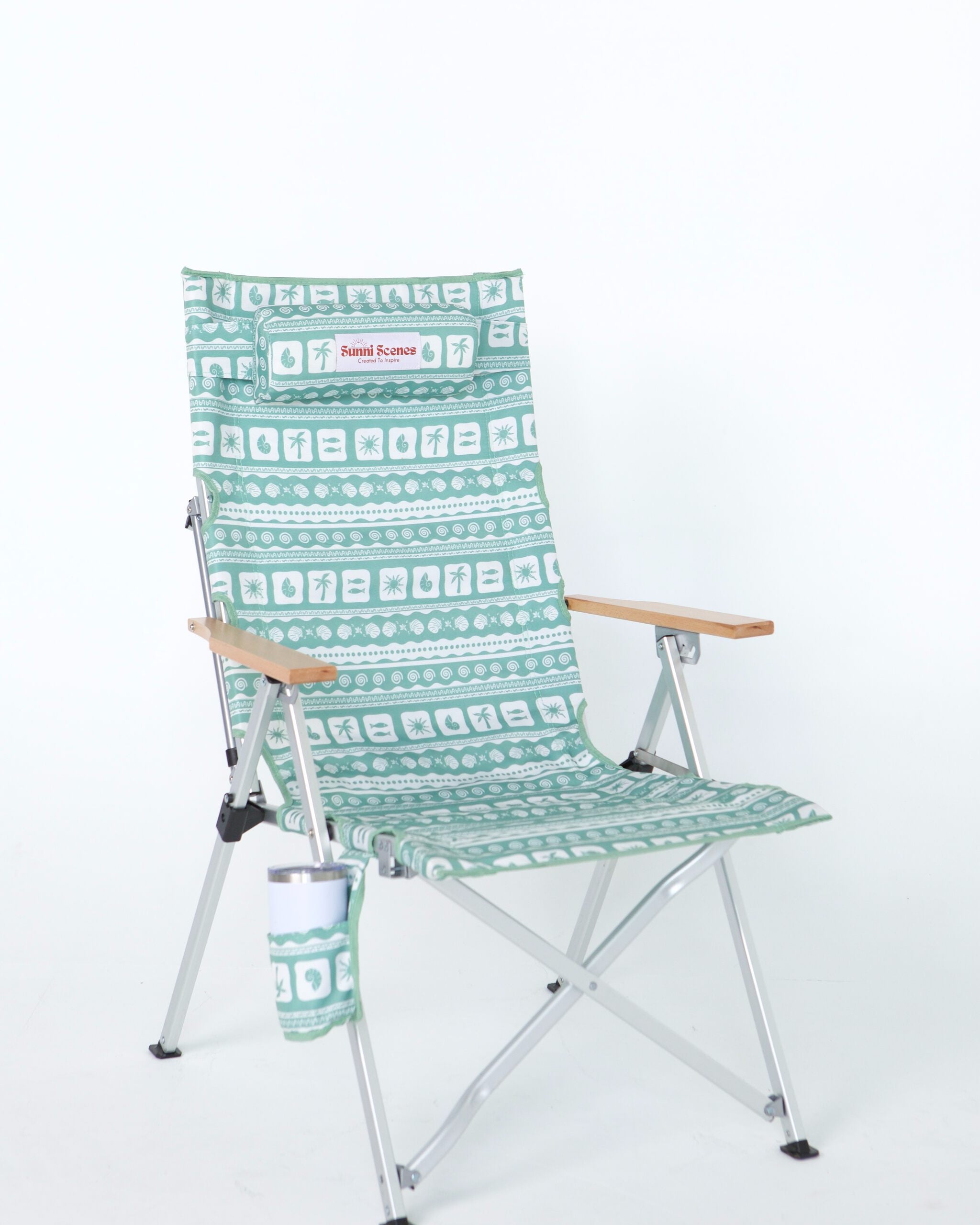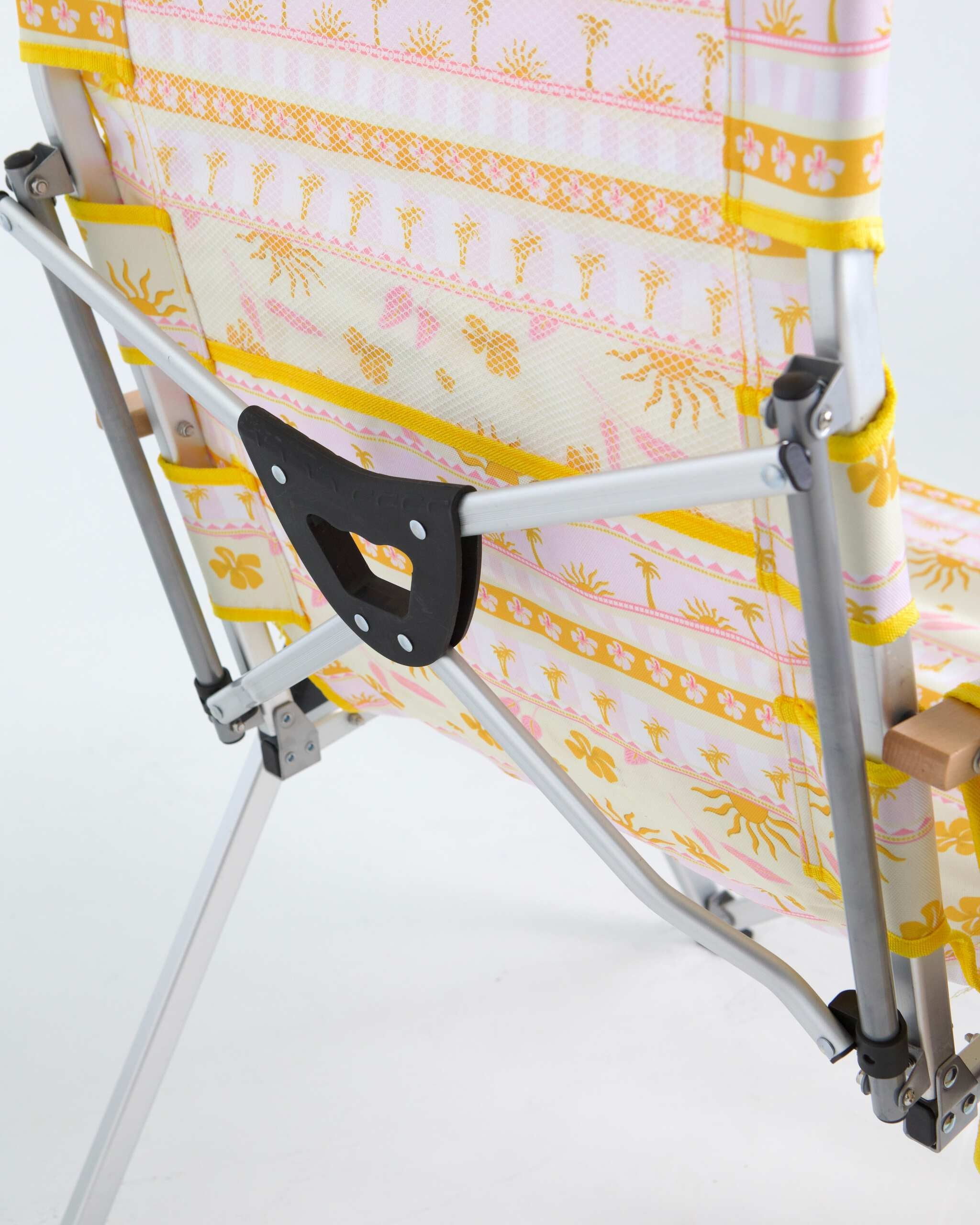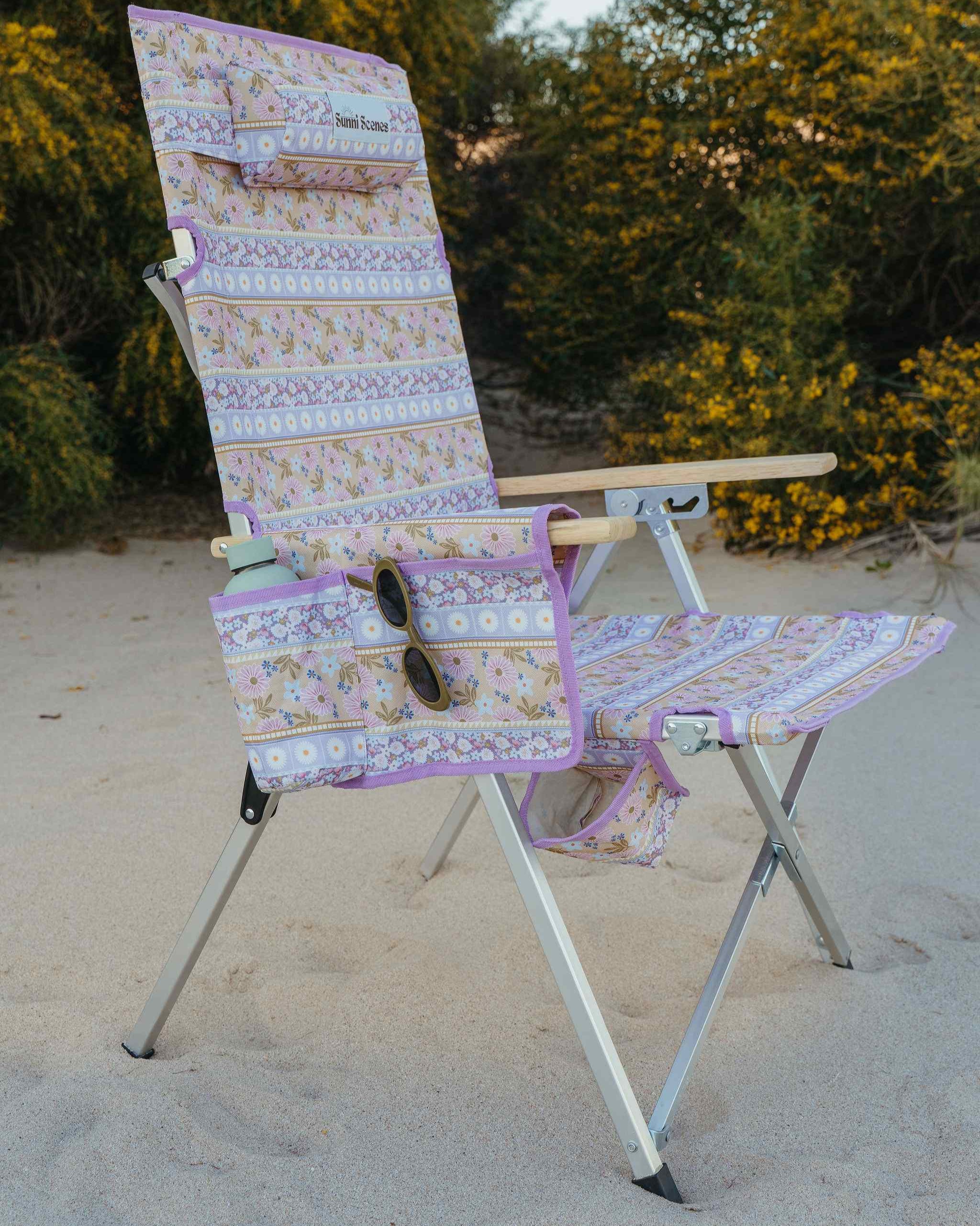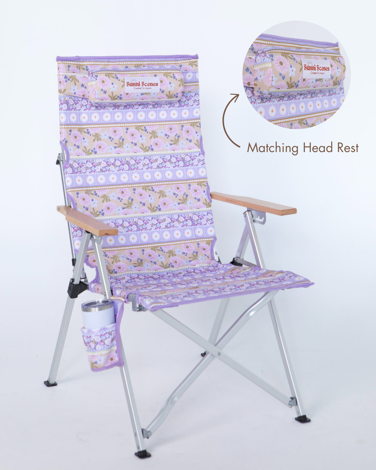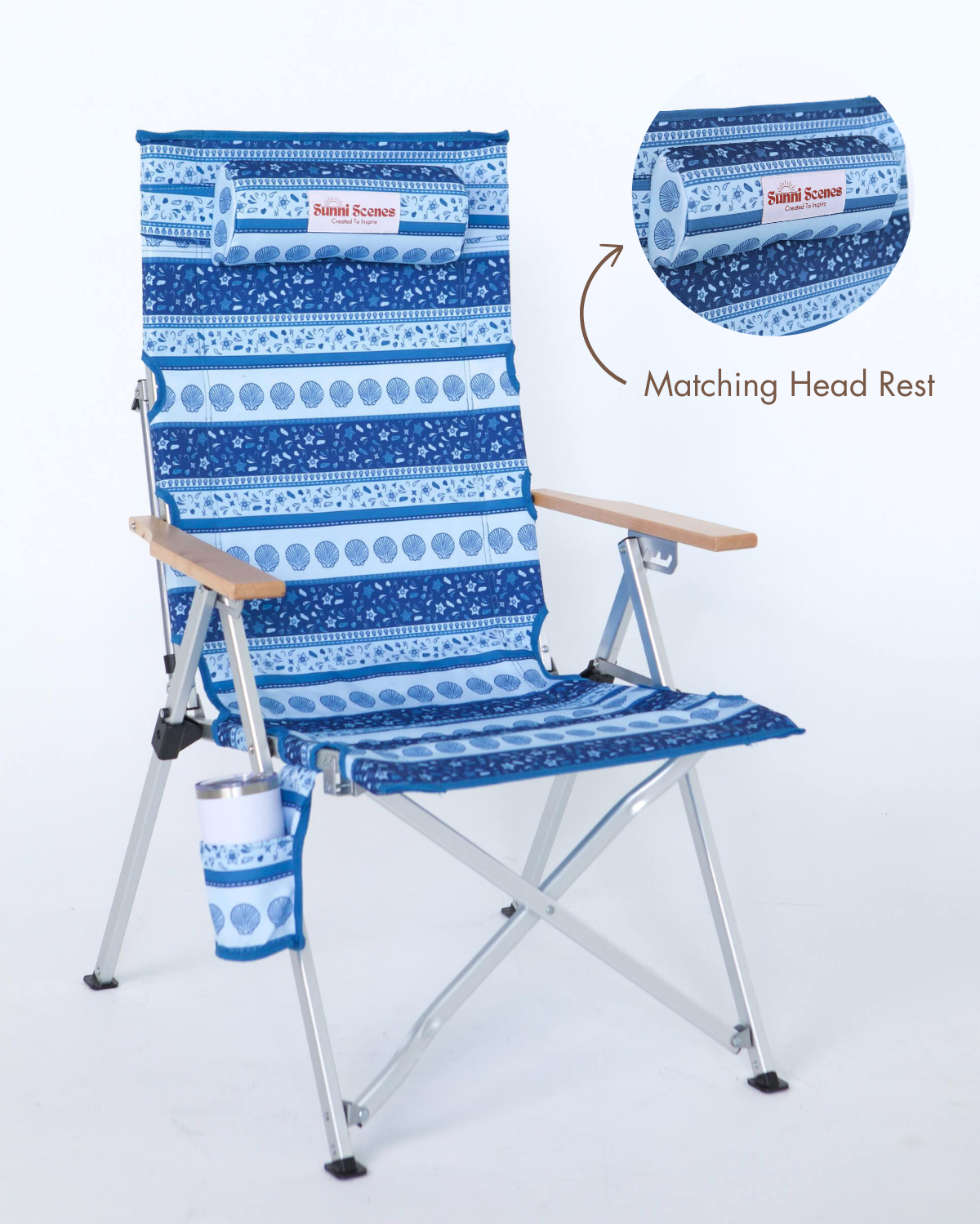 Unique Sunni Scenes prints, Four stage reclining, Removable matching head rest, Compact quad fold pack up design, Generously sized cup holder & Quick dry material.
