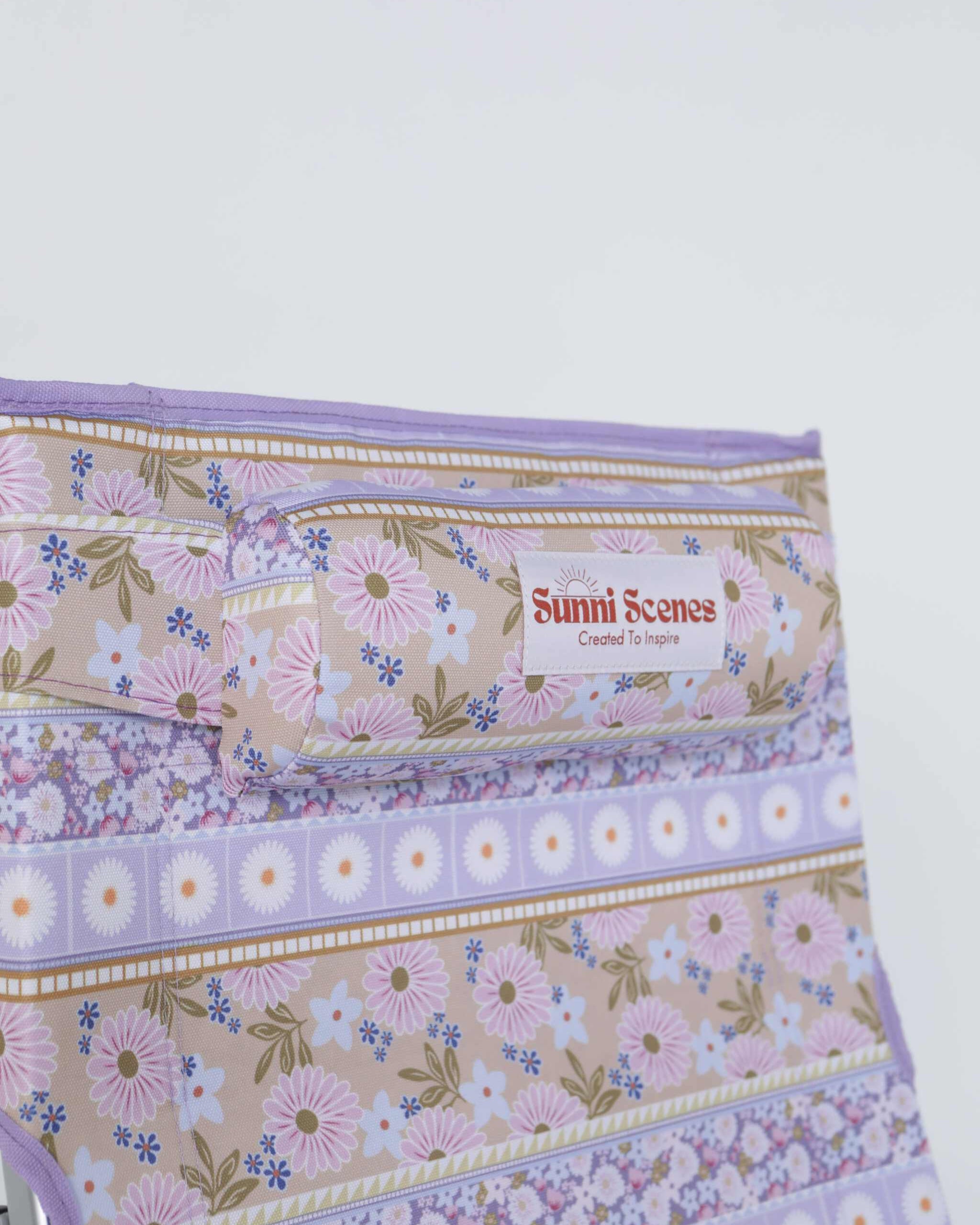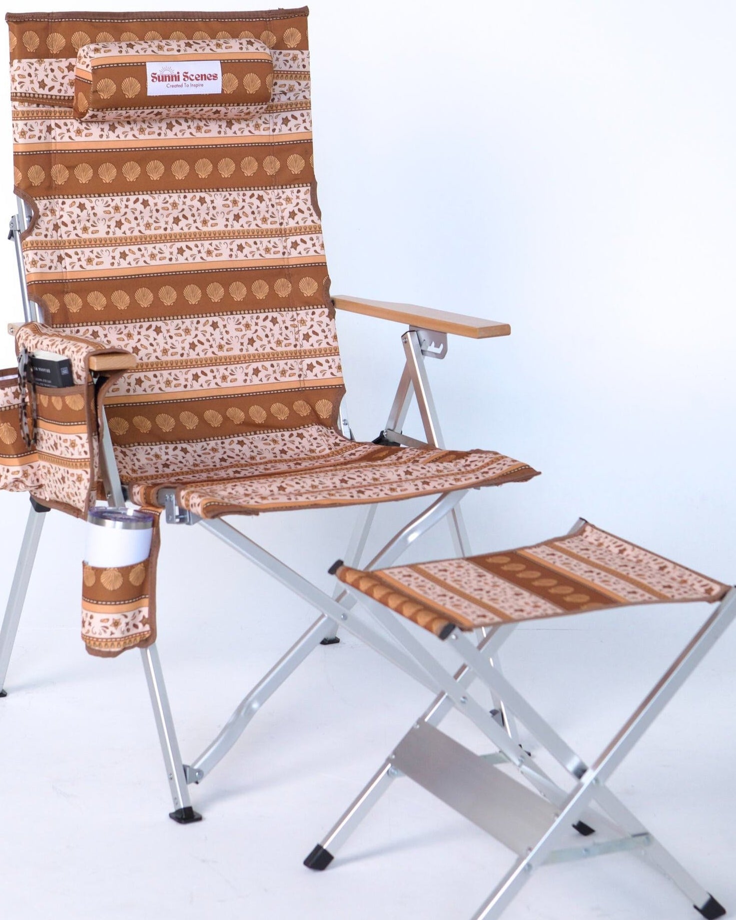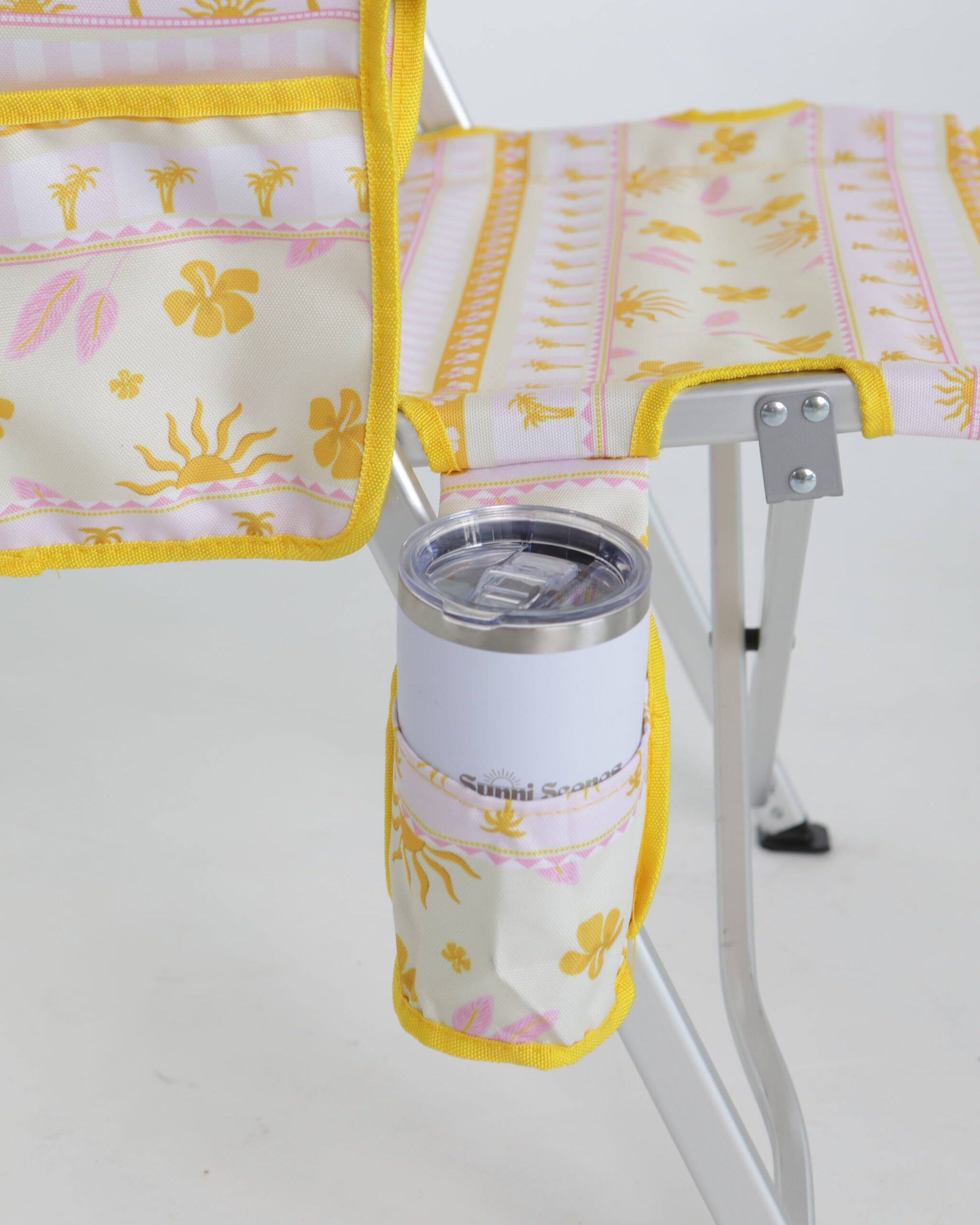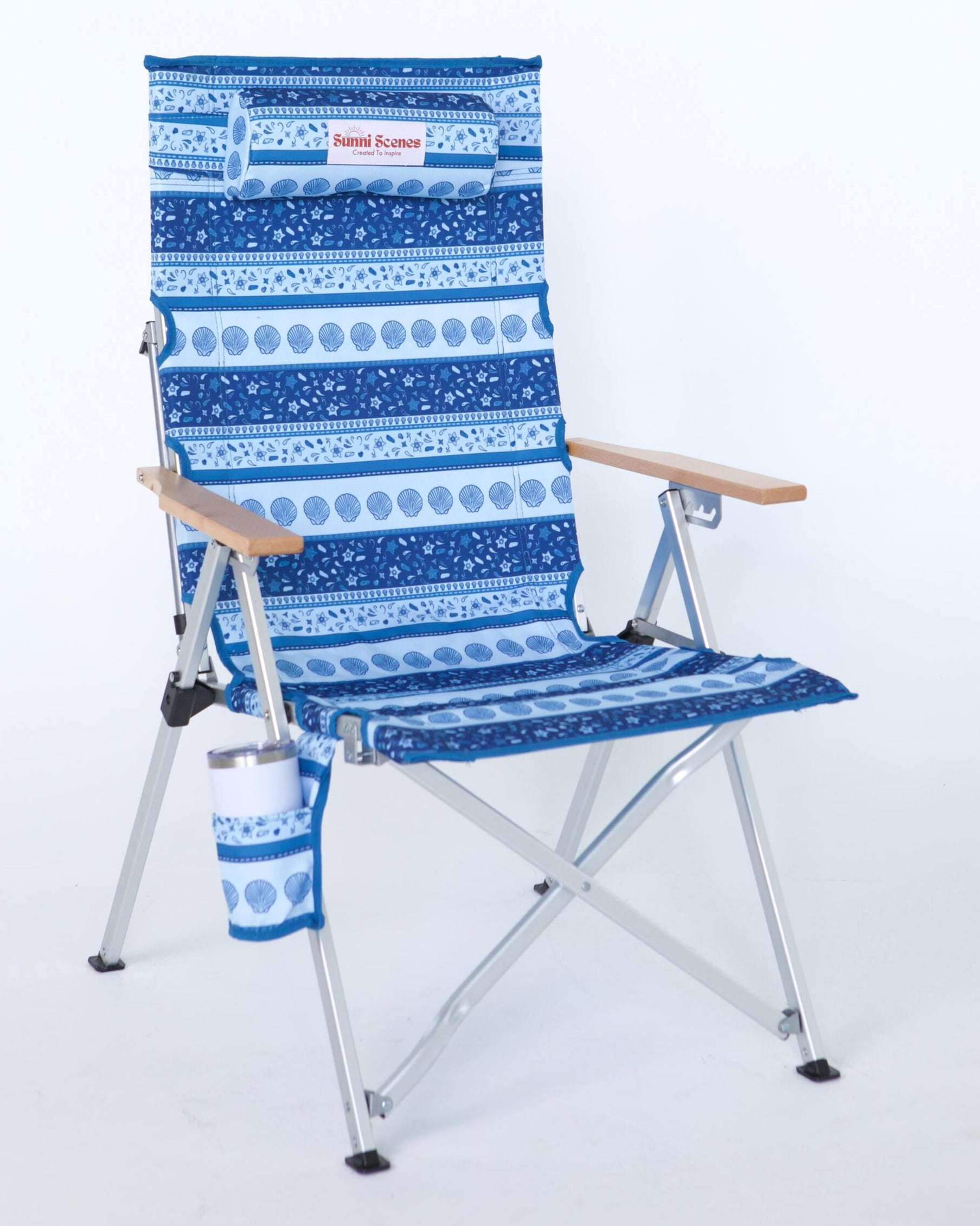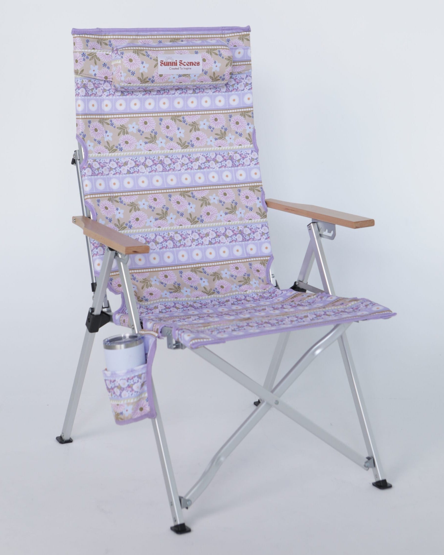 Unique Sunni Scenes prints, Four stage reclining, Removable matching head rest, Compact quad fold pack up design, Generously sized cup holder & Quick dry material.