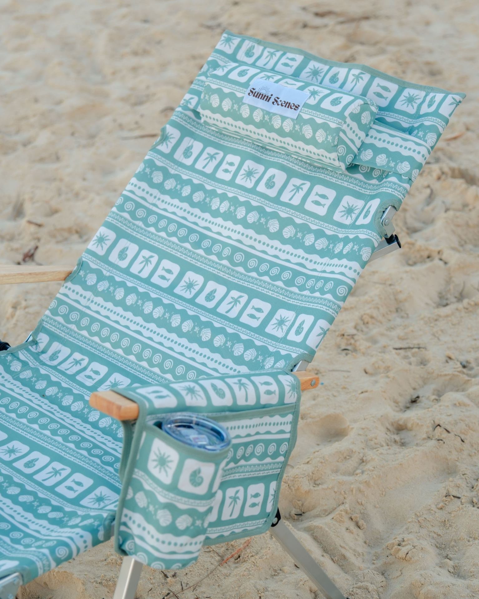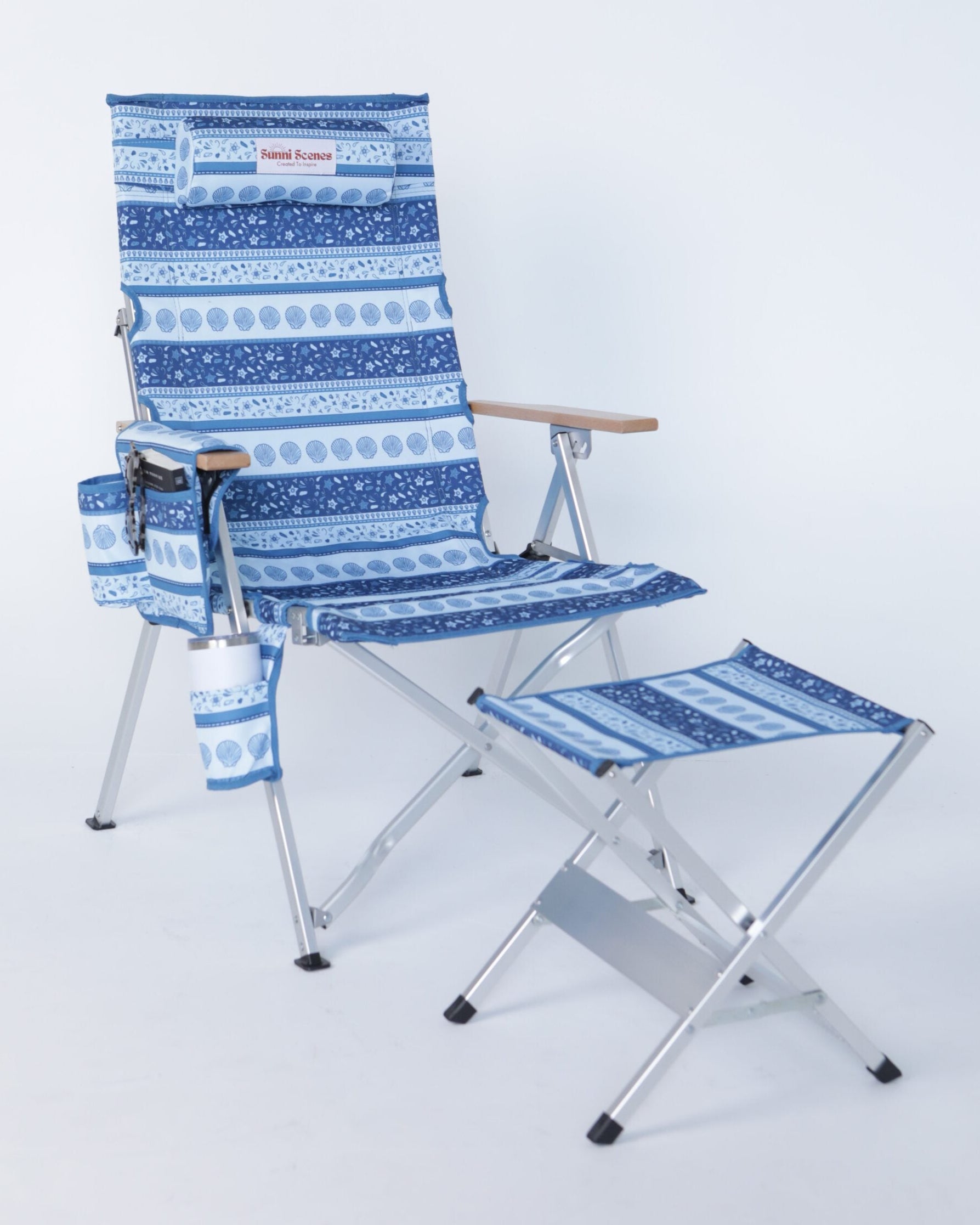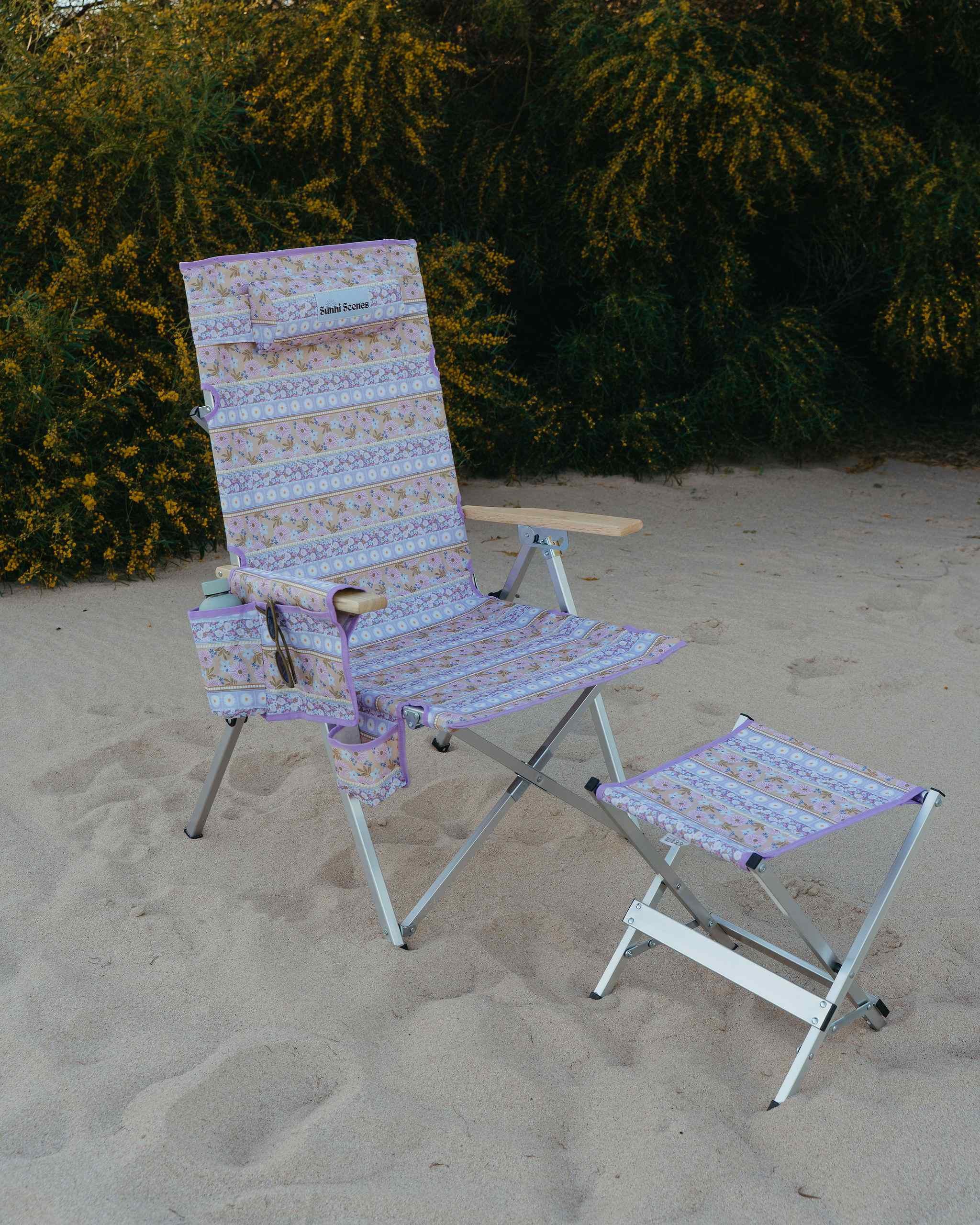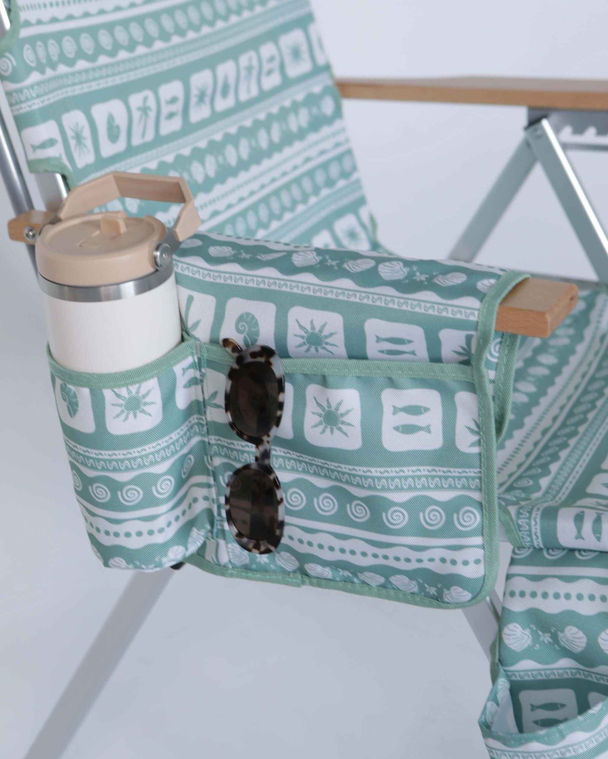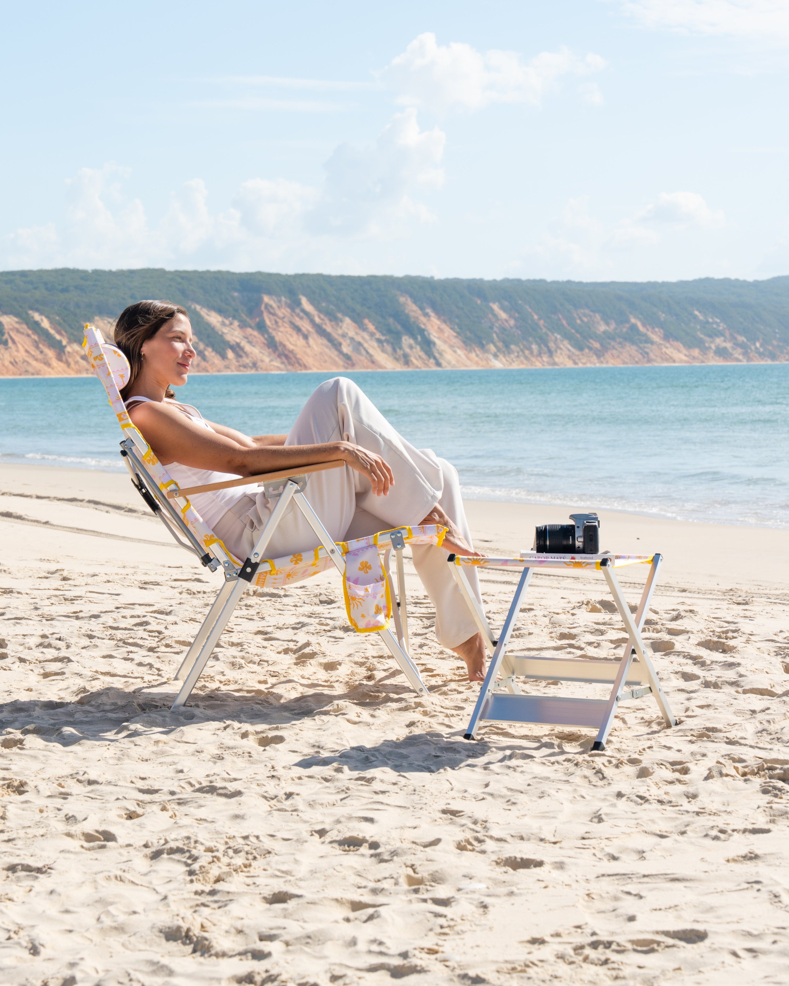 Unique Sunni Scenes prints, Four stage reclining, Removable matching head rest, Compact quad fold pack up design, Generously sized cup holder & Quick dry material.
