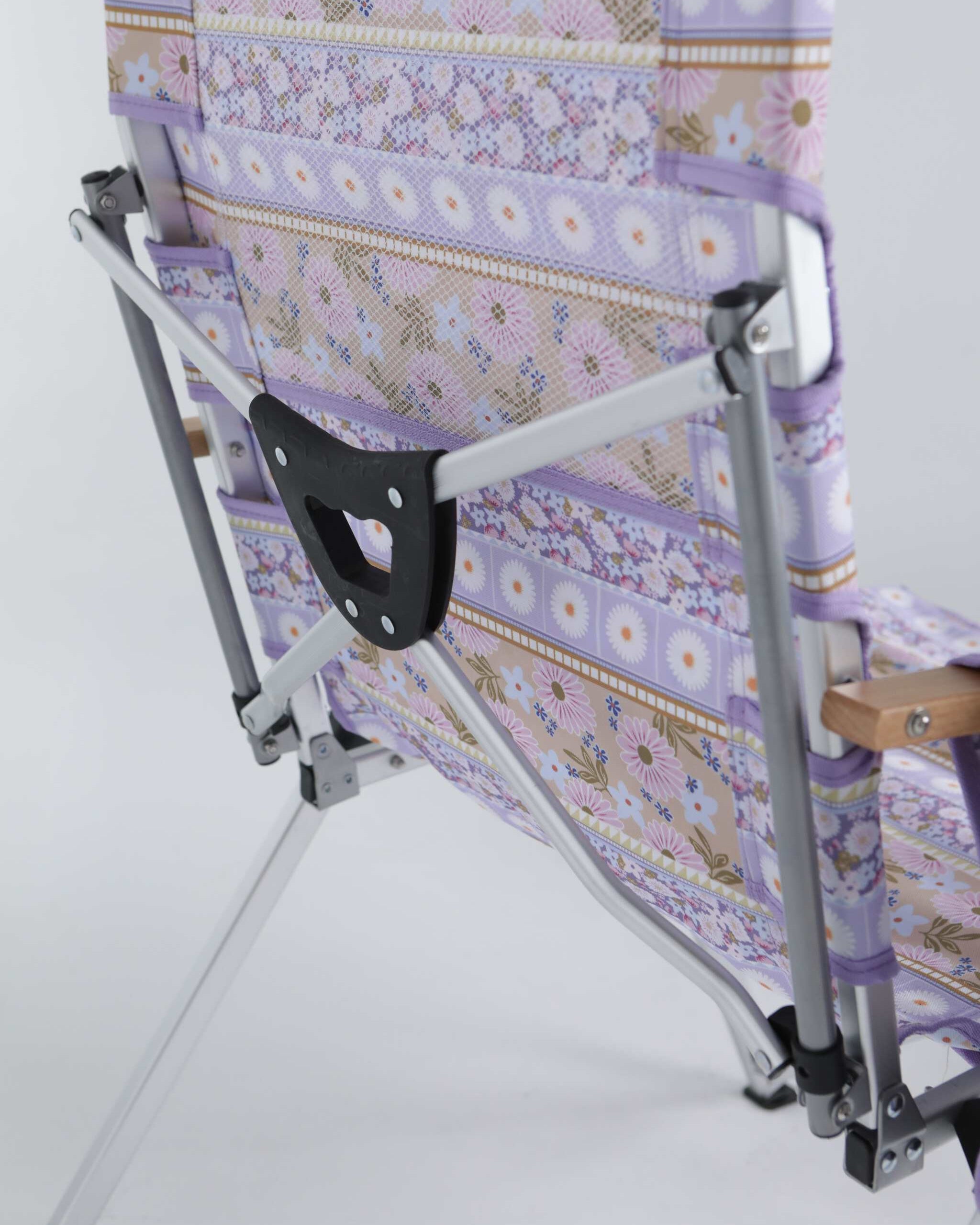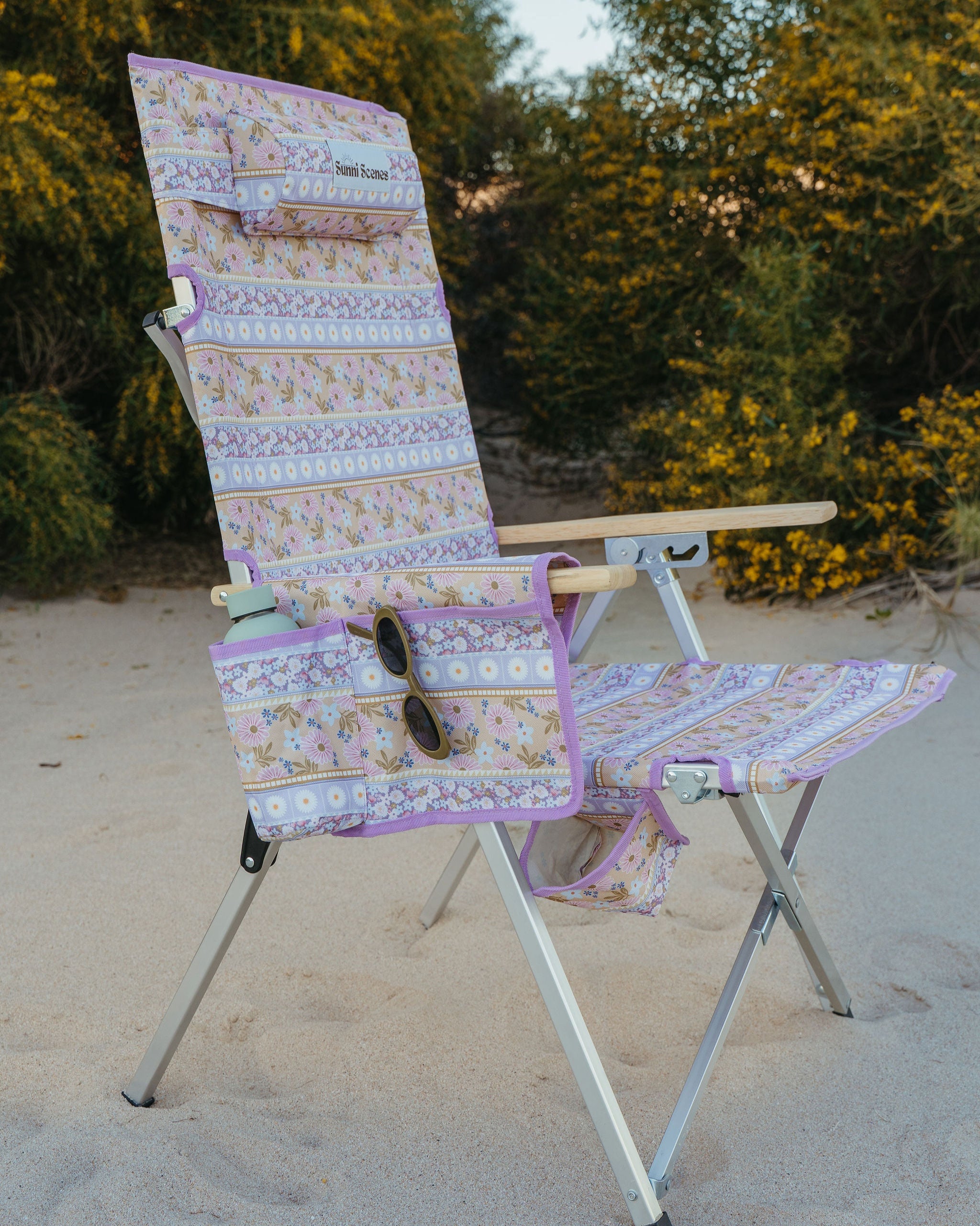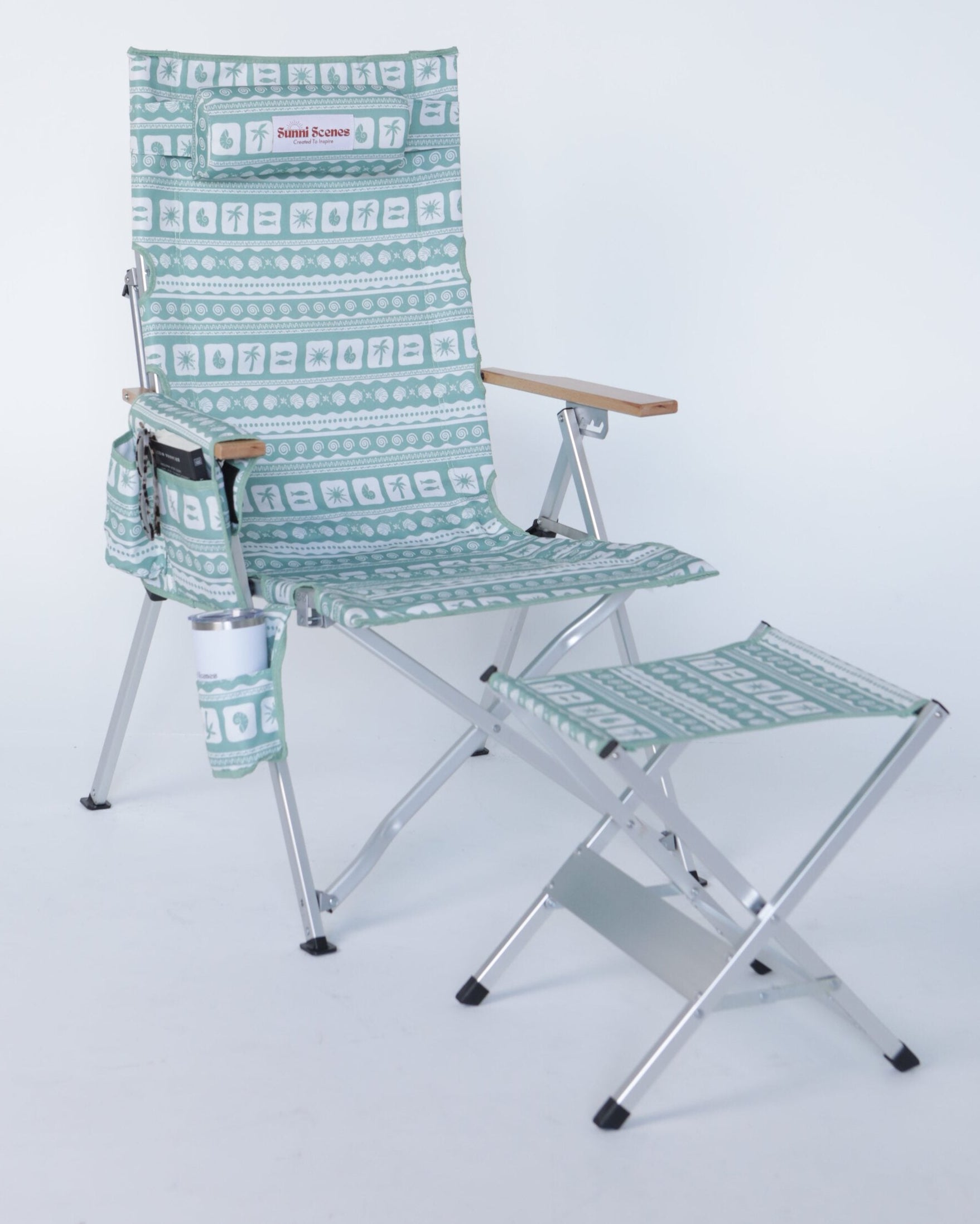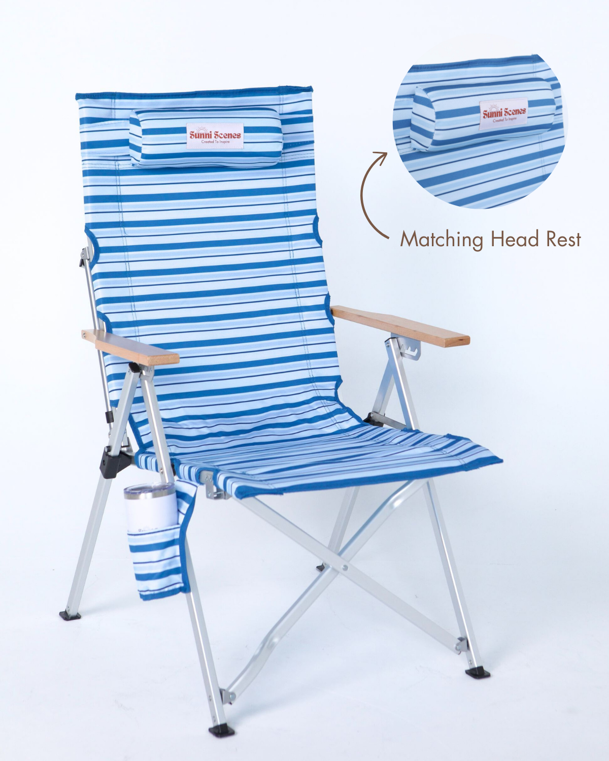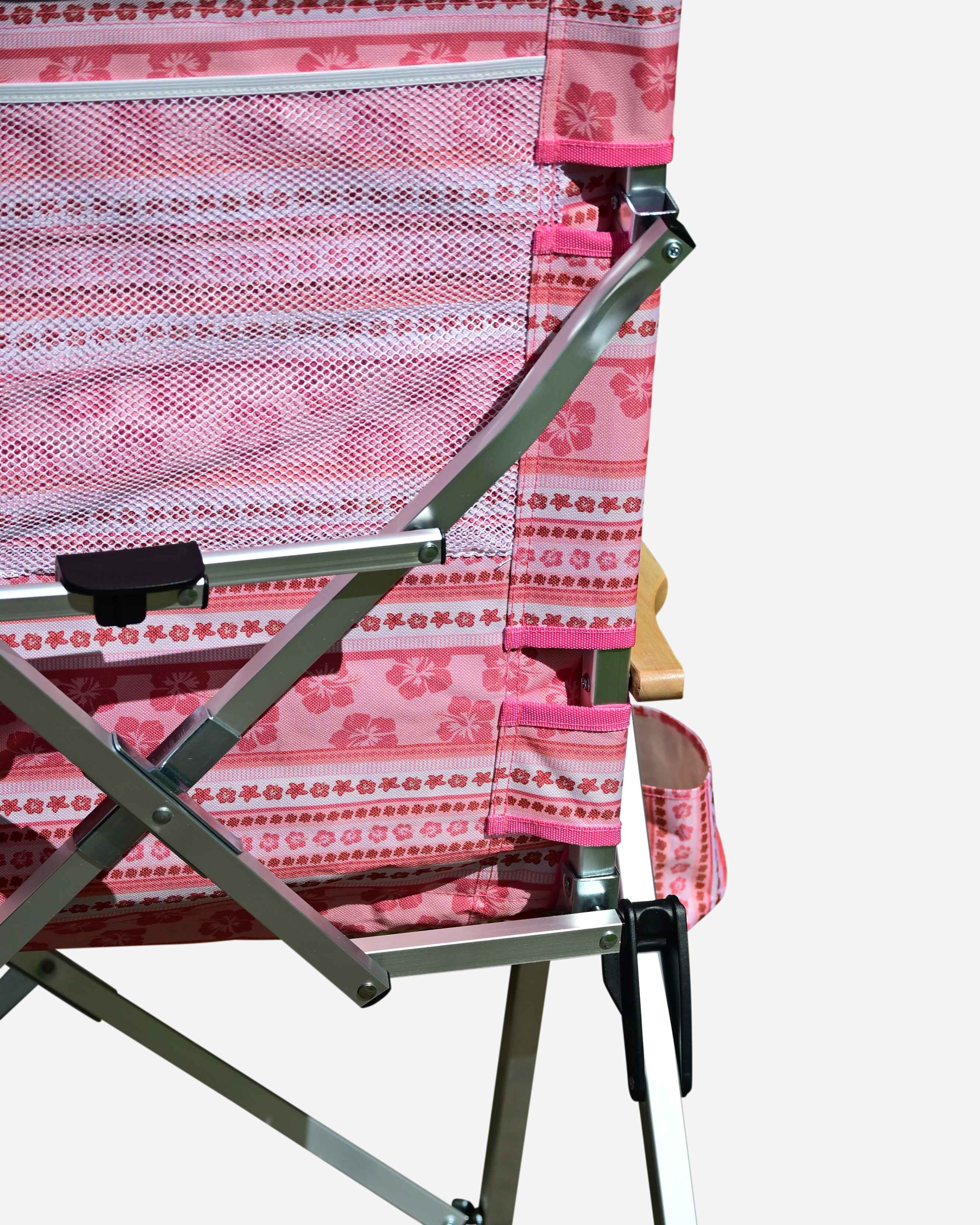 Unique Sunni Scenes prints, Four stage reclining, Removable matching head rest, Compact quad fold pack up design, Generously sized cup holder & Quick dry material.