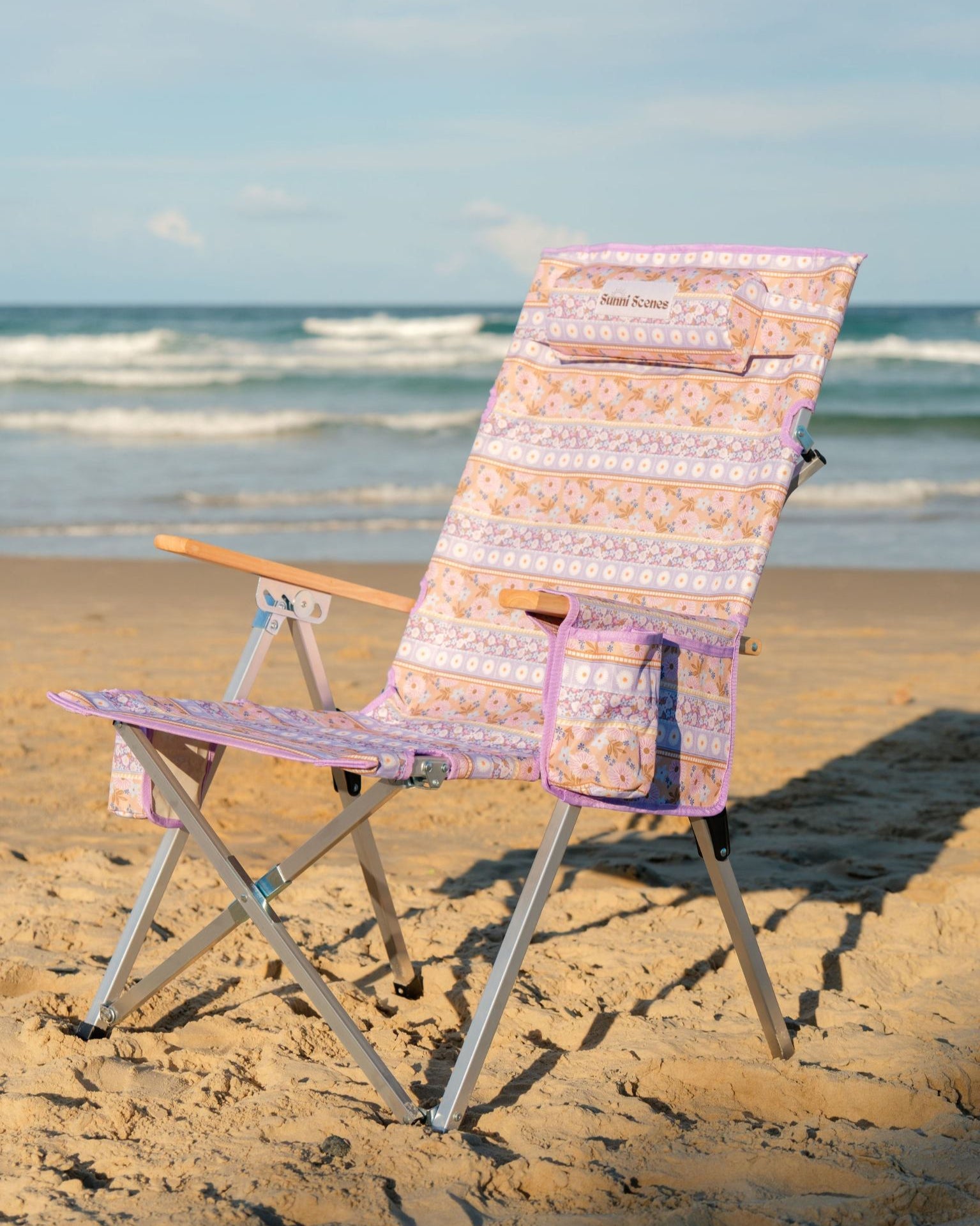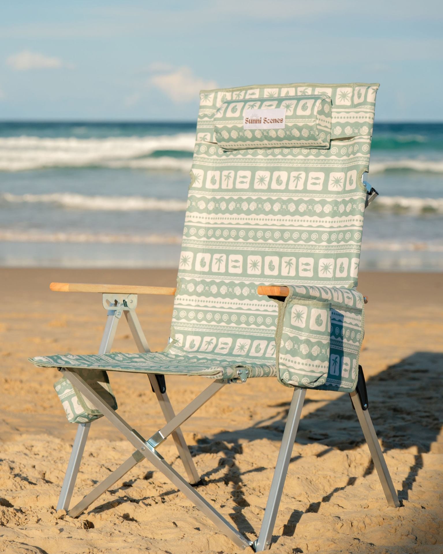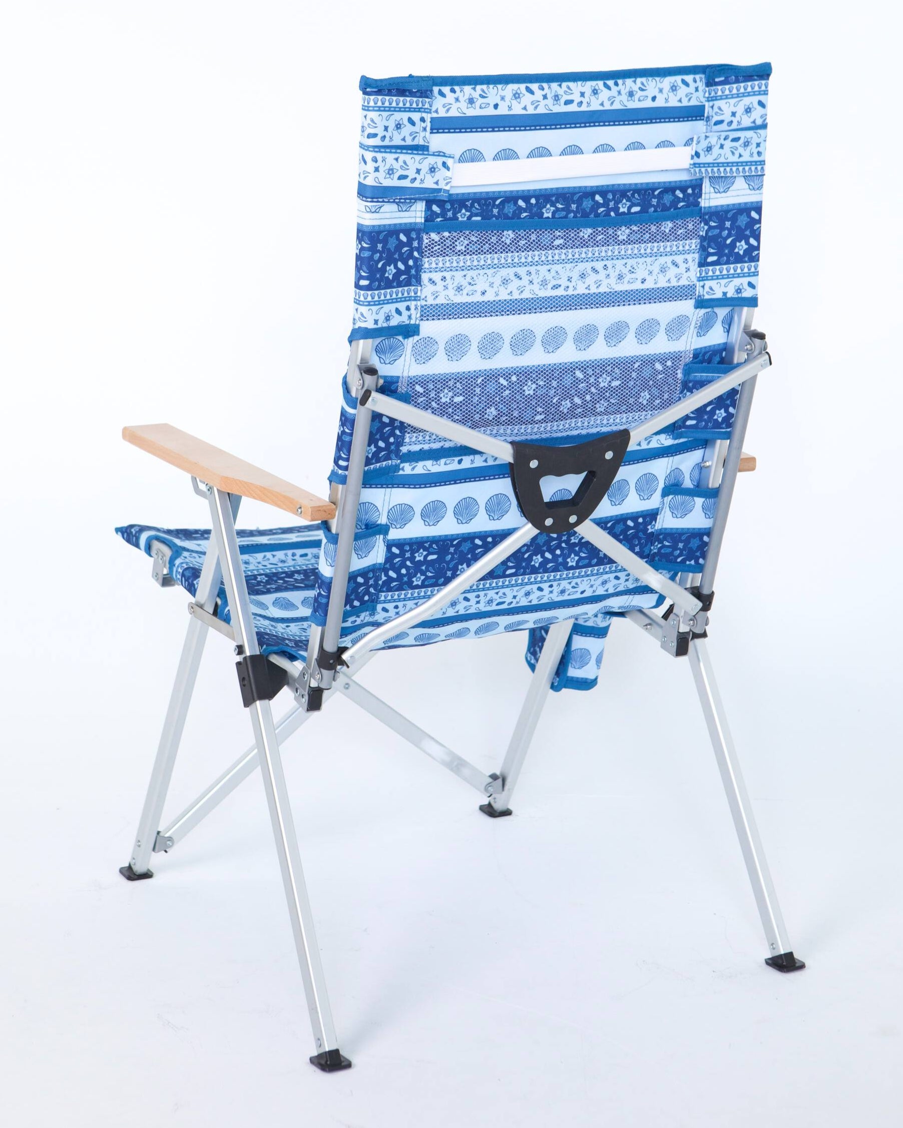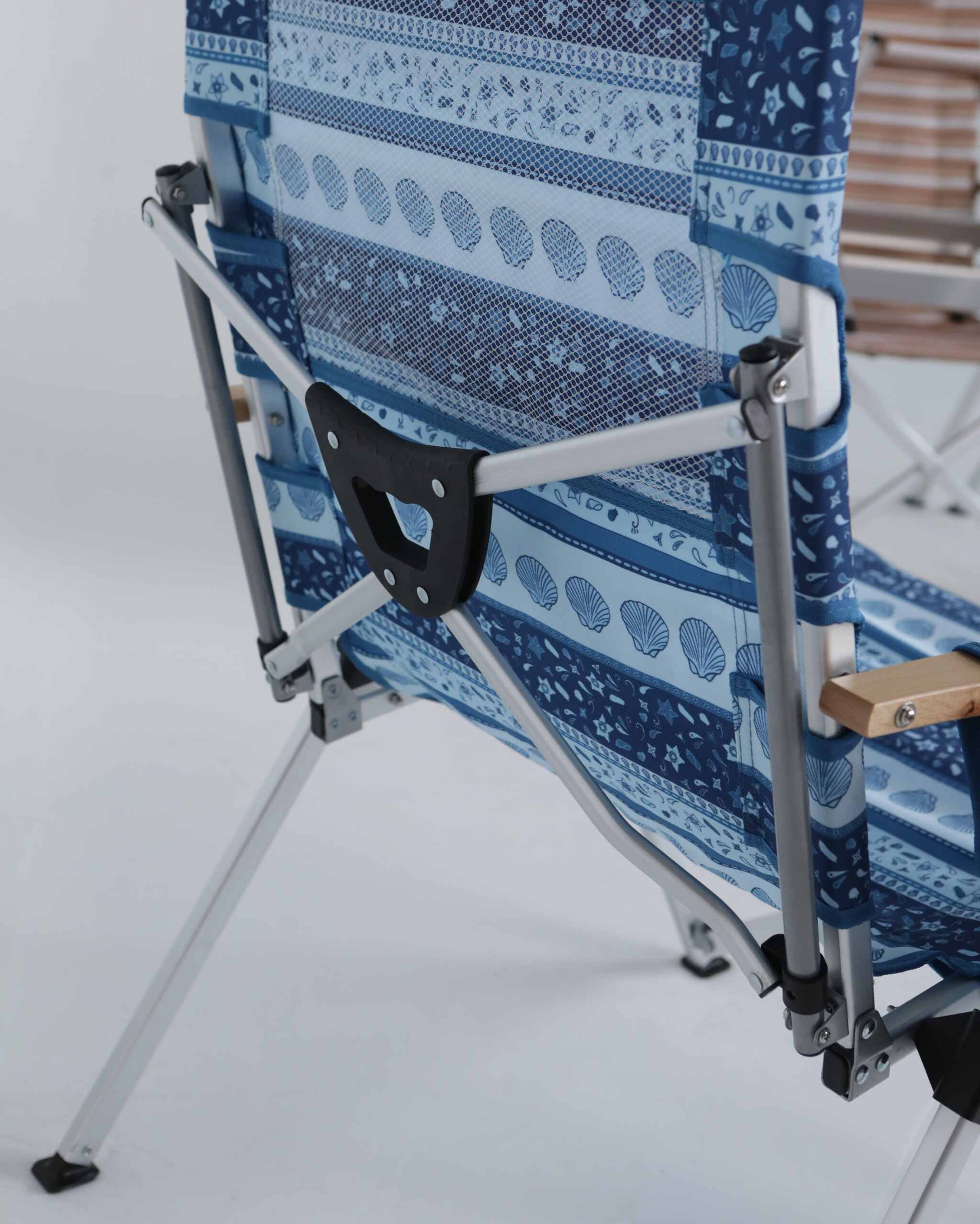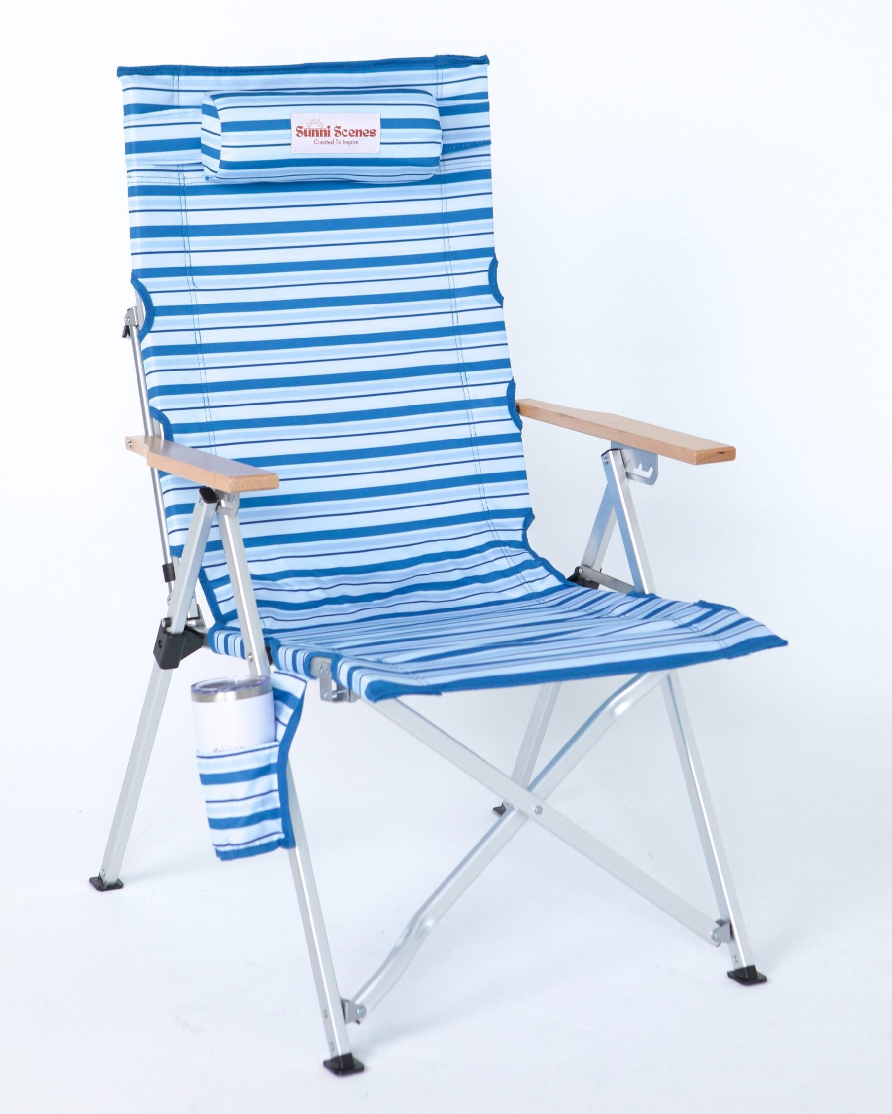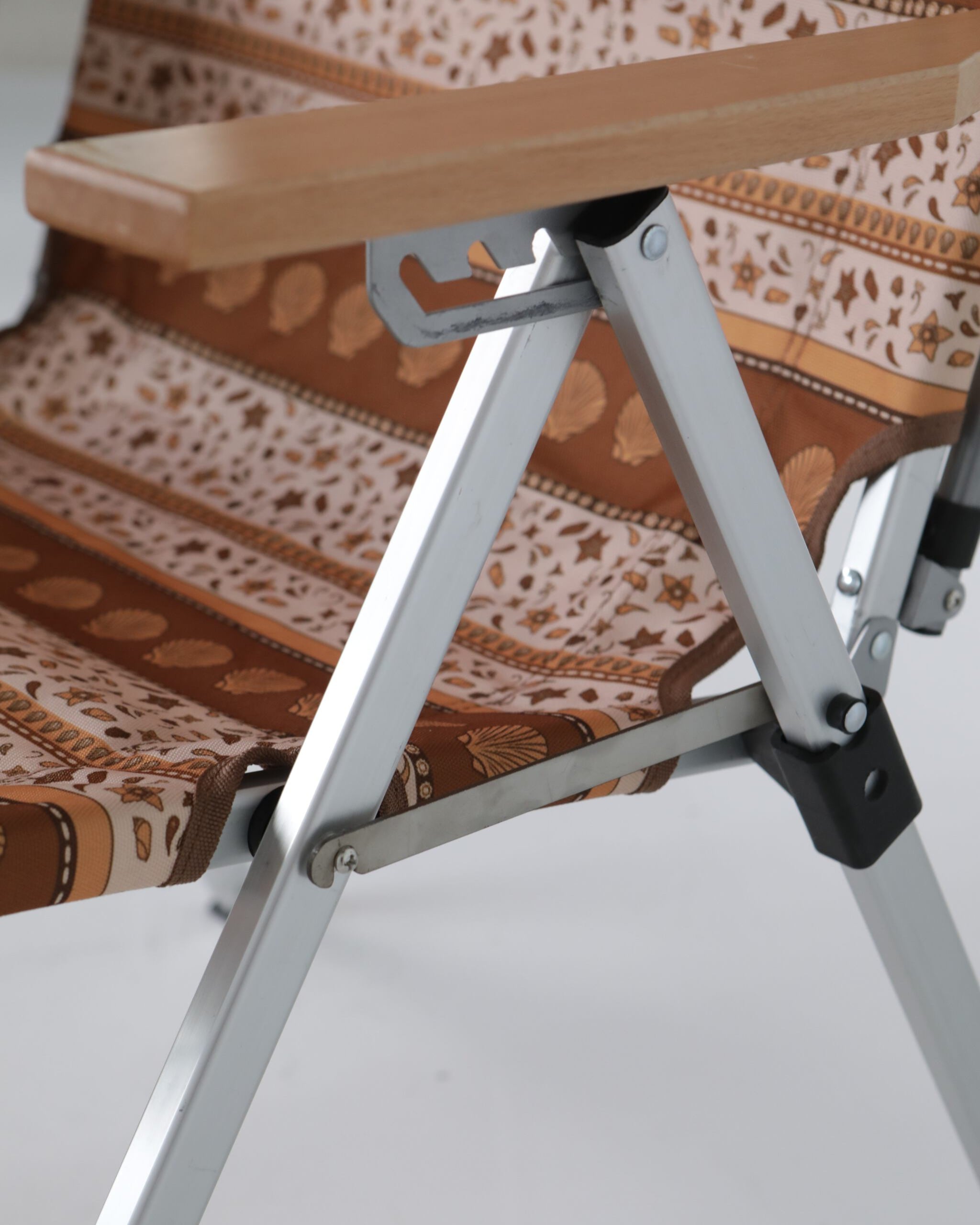 Unique Sunni Scenes prints, Four stage reclining, Removable matching head rest, Compact quad fold pack up design, Generously sized cup holder & Quick dry material.