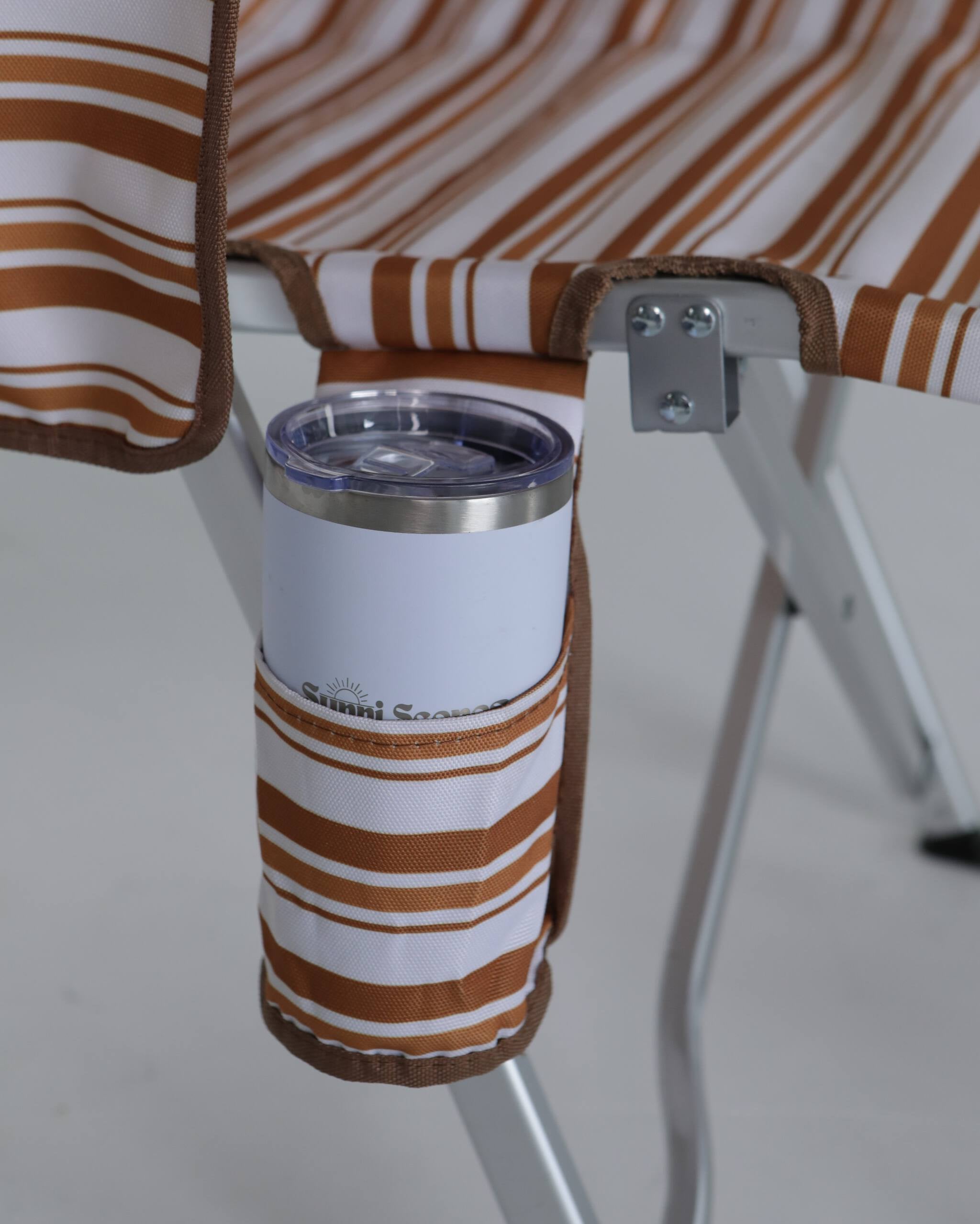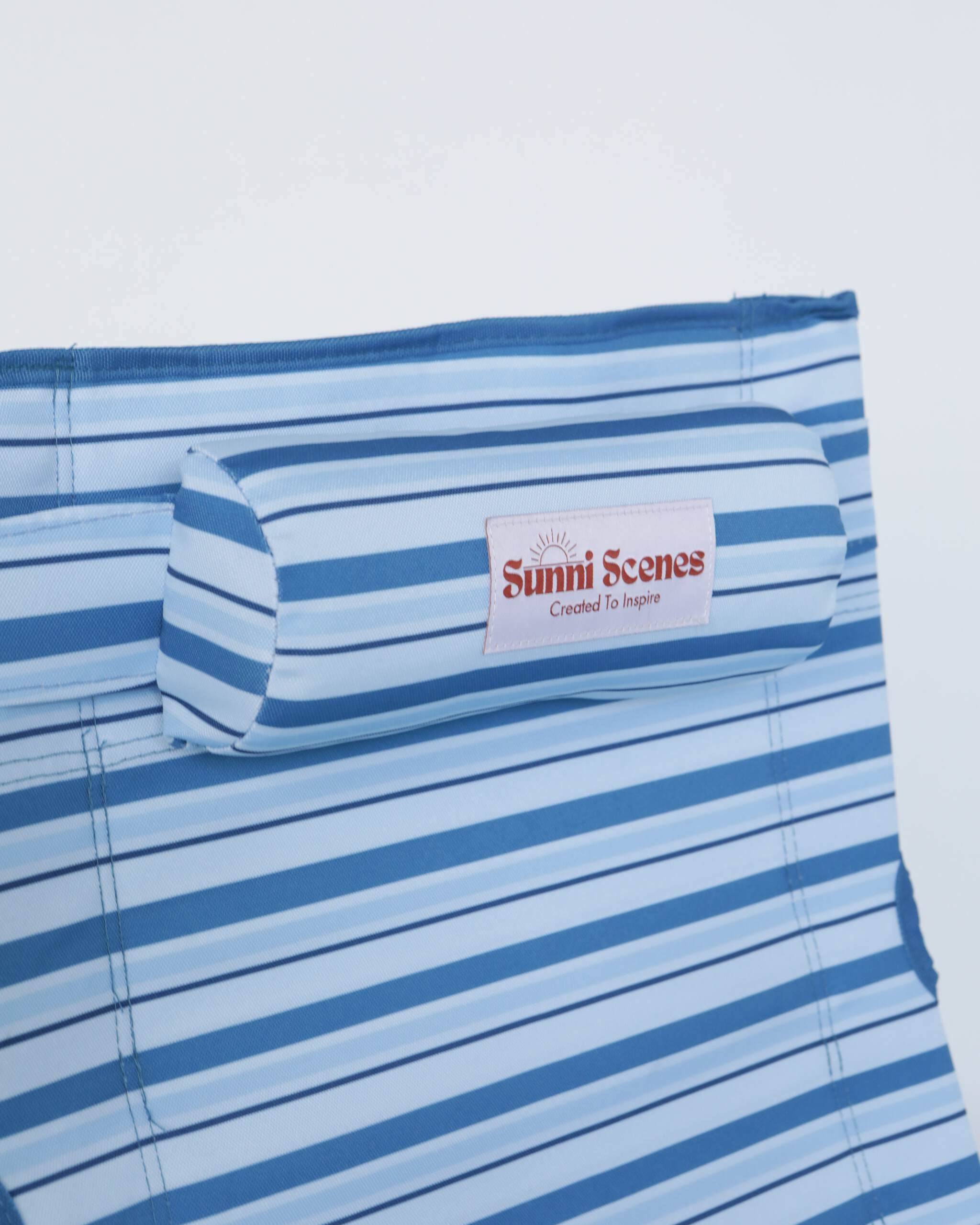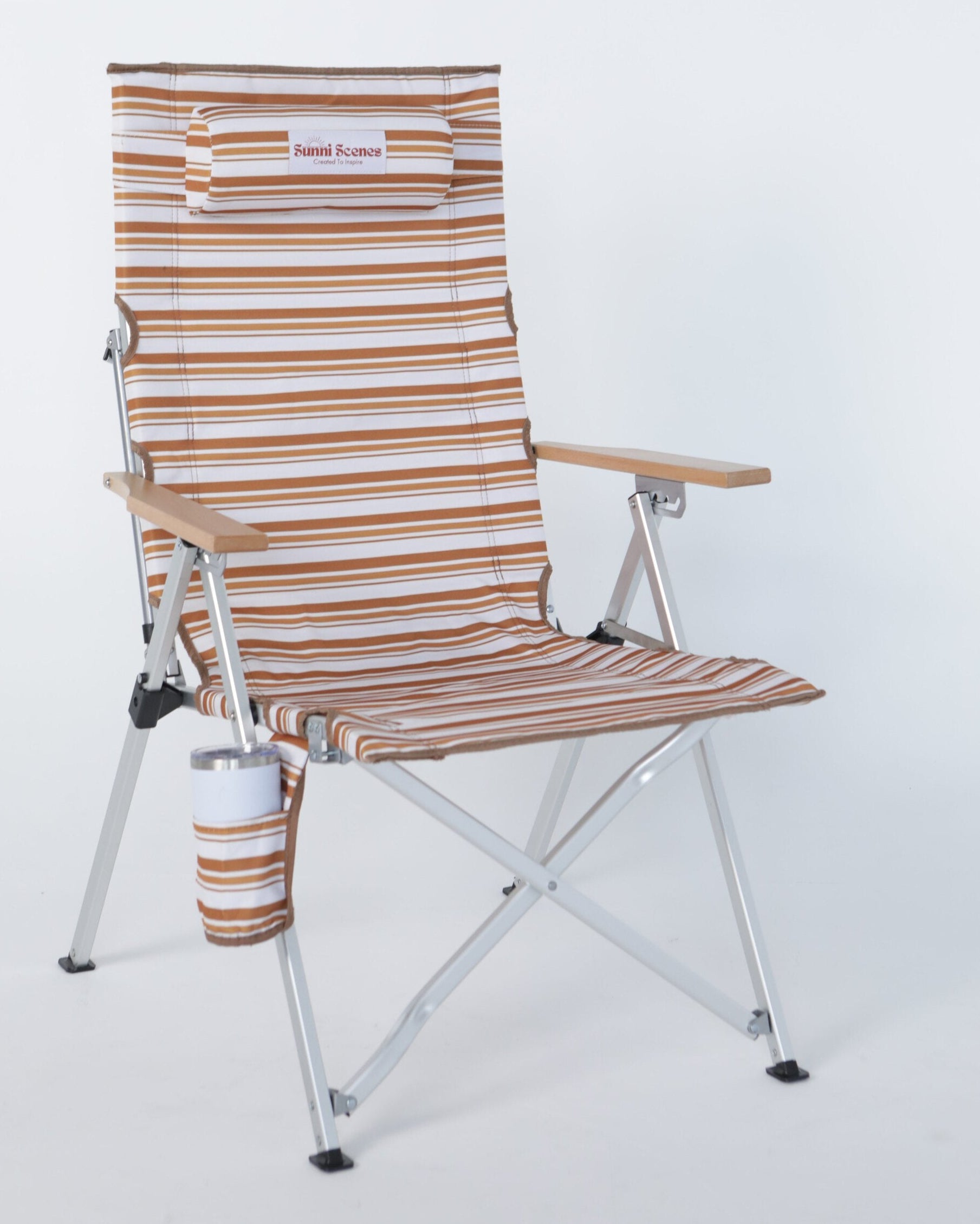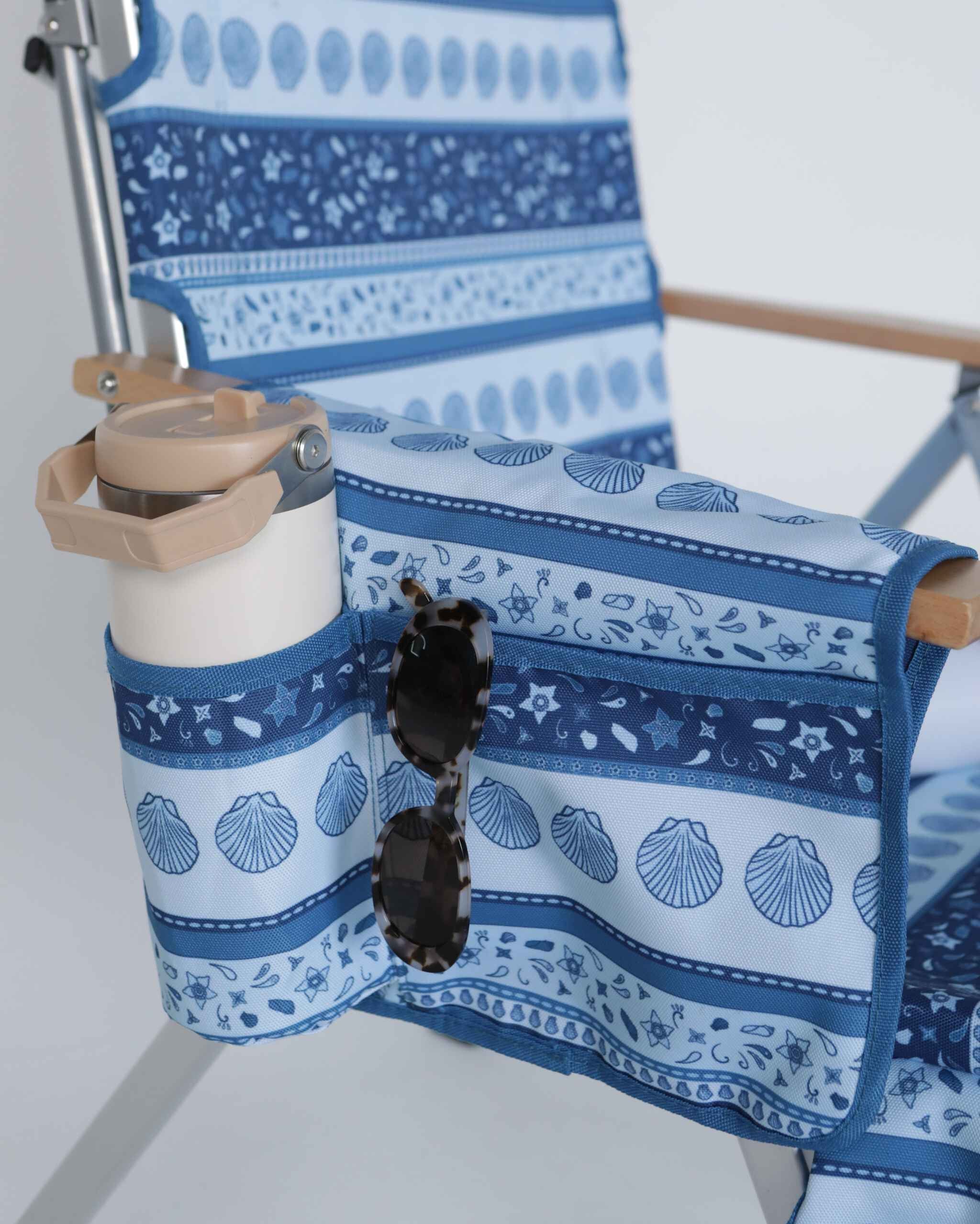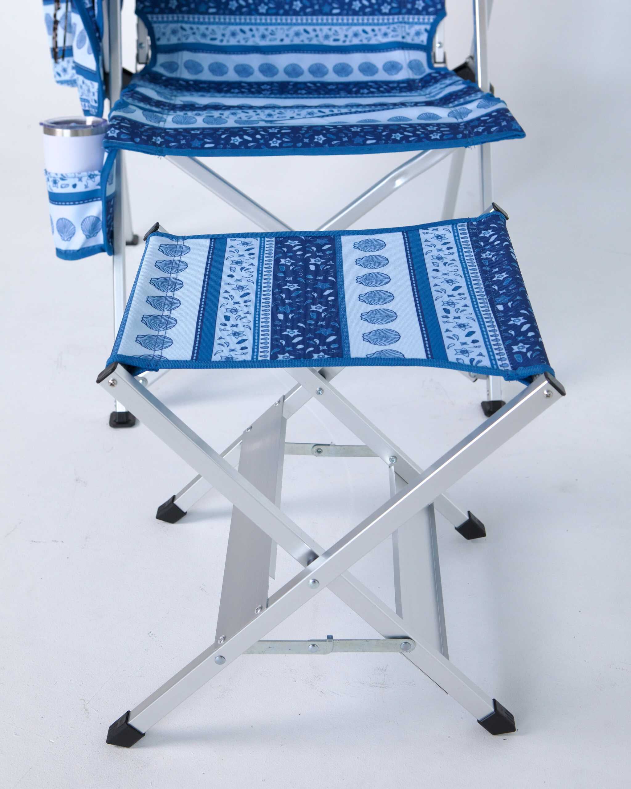 Unique Sunni Scenes prints, Four stage reclining, Removable matching head rest, Compact quad fold pack up design, Generously sized cup holder & Quick dry material.