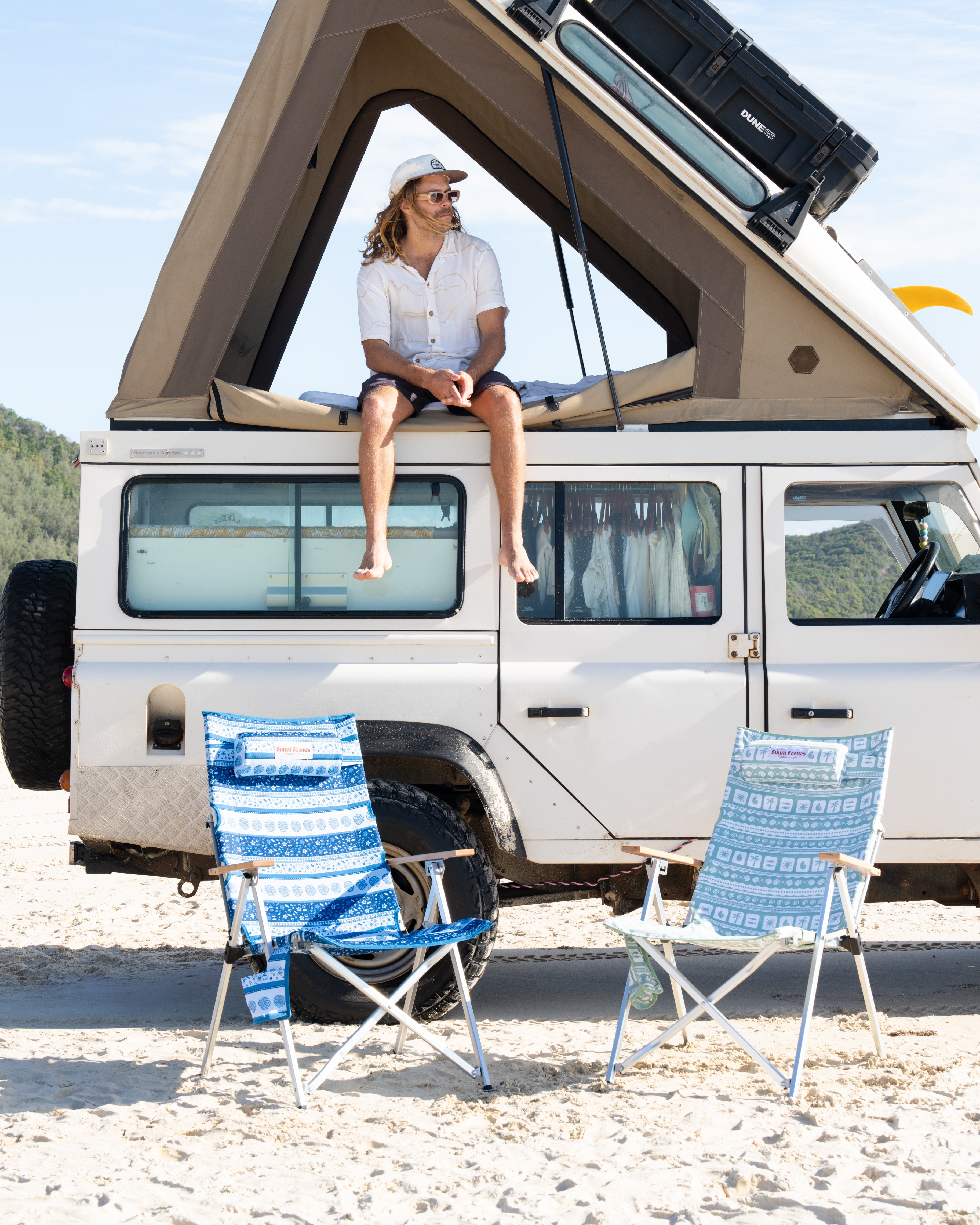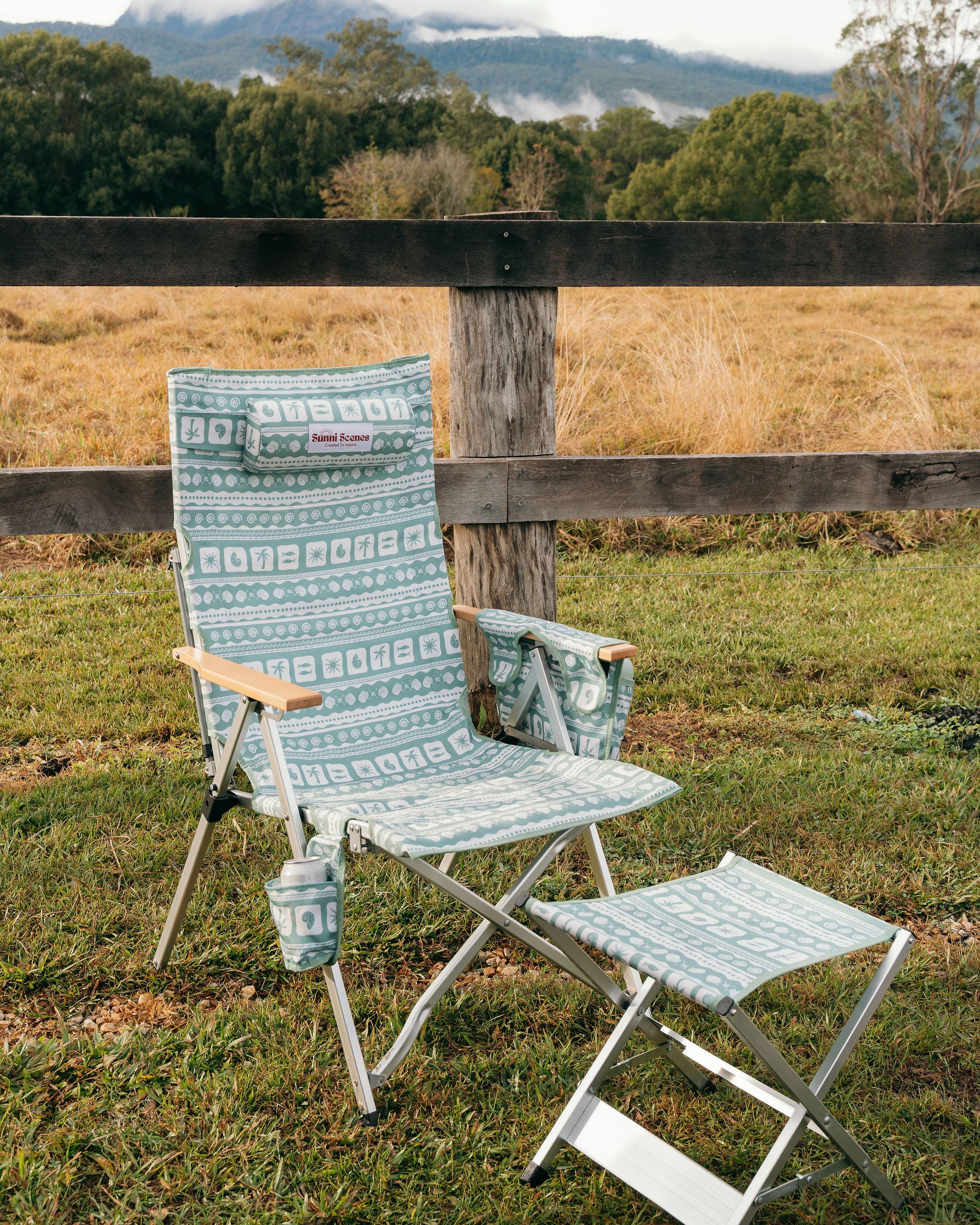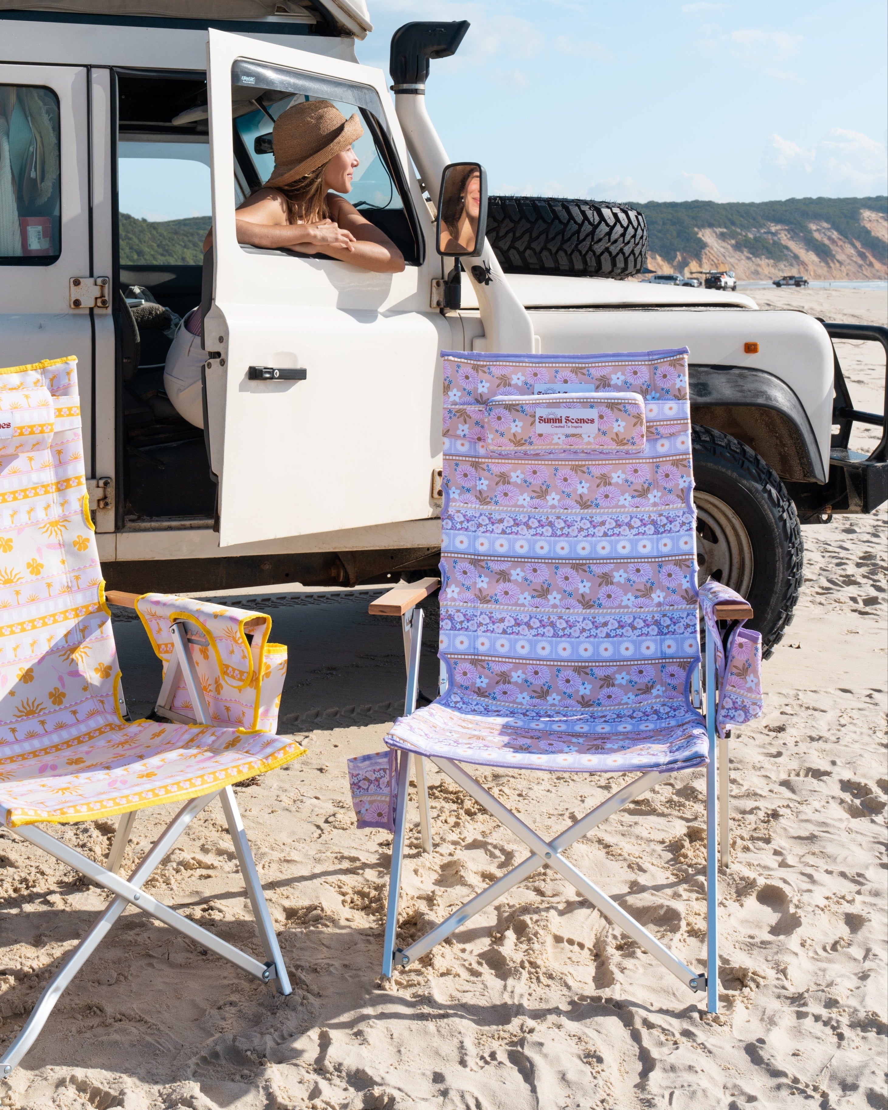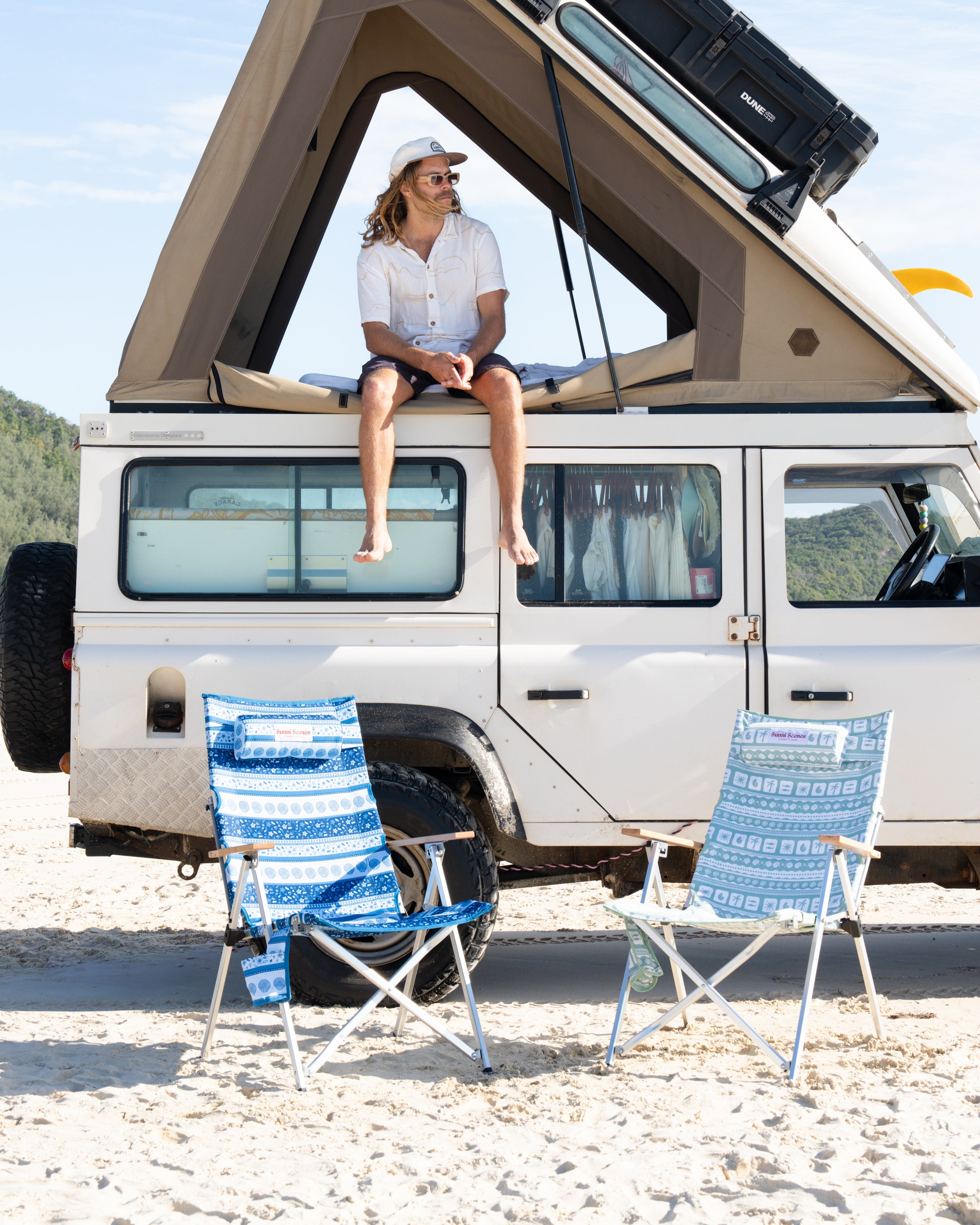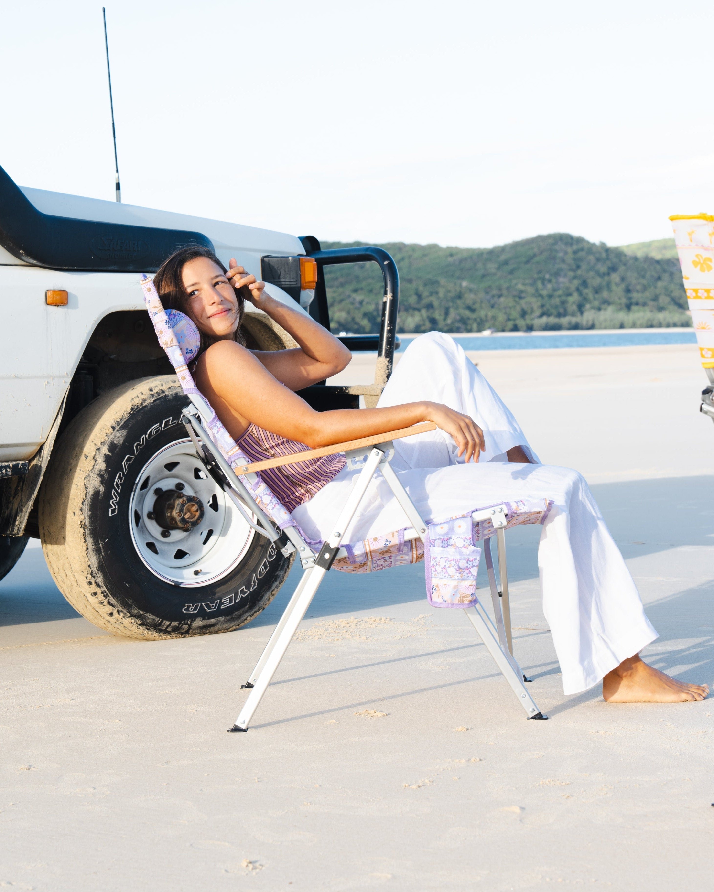 What sets our chairs apart is their compact folding design, reminiscent of classic camp chairs, making them easy to transport and store. Available in exclusive Sunni Scenes printed patterns, these chairs are the only ones of their kind in Australia, adding a unique flair to your camping gear.