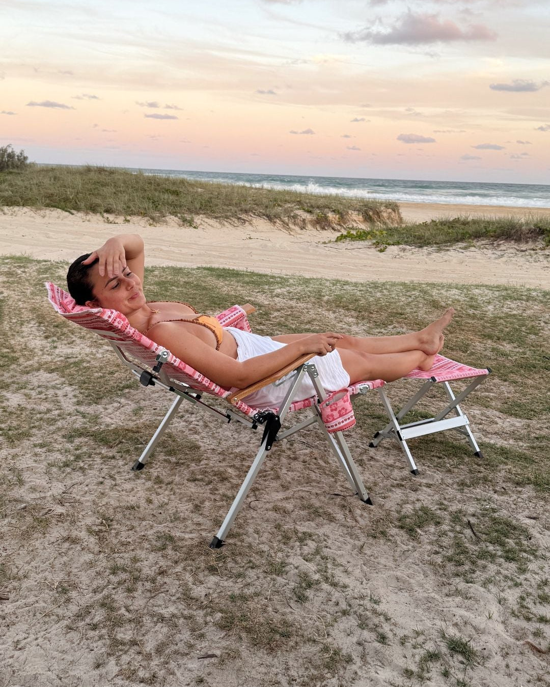 1x Hibiscus Reclining Camp Chair (4.4 kg) – 4-stage recline, high supportive back, removable headrest, breathable quick-dry fabric, oversized drink holder, and a compact lightweight frame. The Reef print hides dirt while bringing bold colour and personality to your setup.