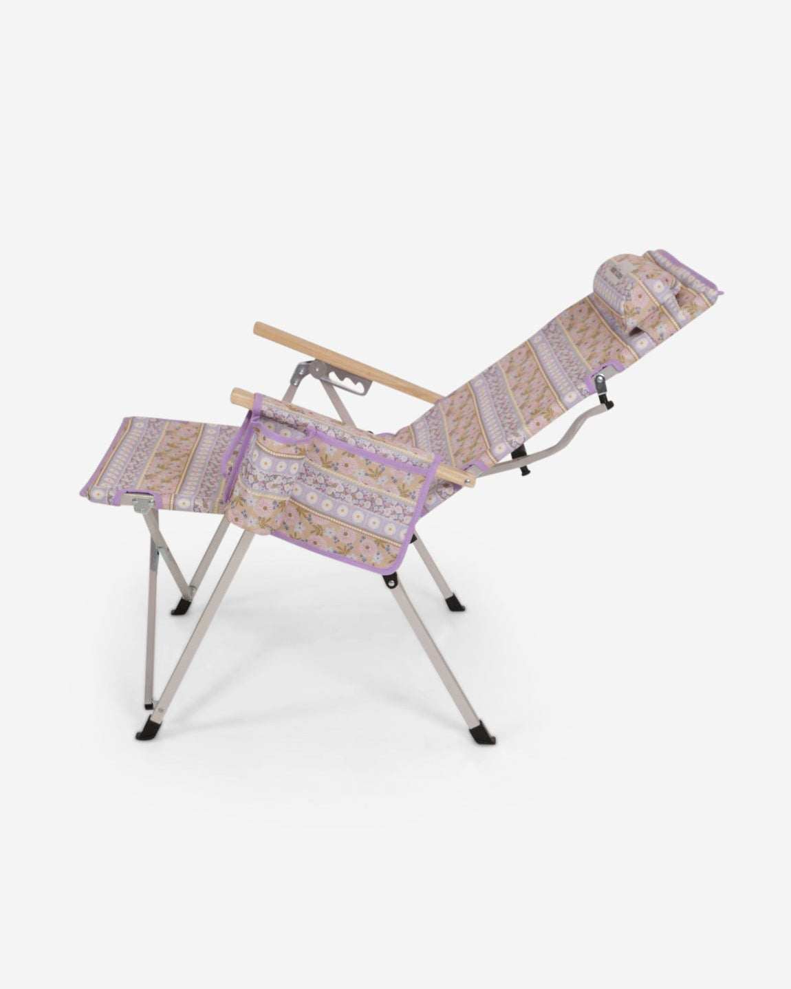1x Lavender Reclining Camp Chair (4.6 kg each) – 4-stage recline, high supportive back, removable headrest, breathable quick-dry fabric, oversized drink holder, and a lightweight aluminium frame. The Lavender print adds a soft, stylish touch while cleverly hiding dirt.