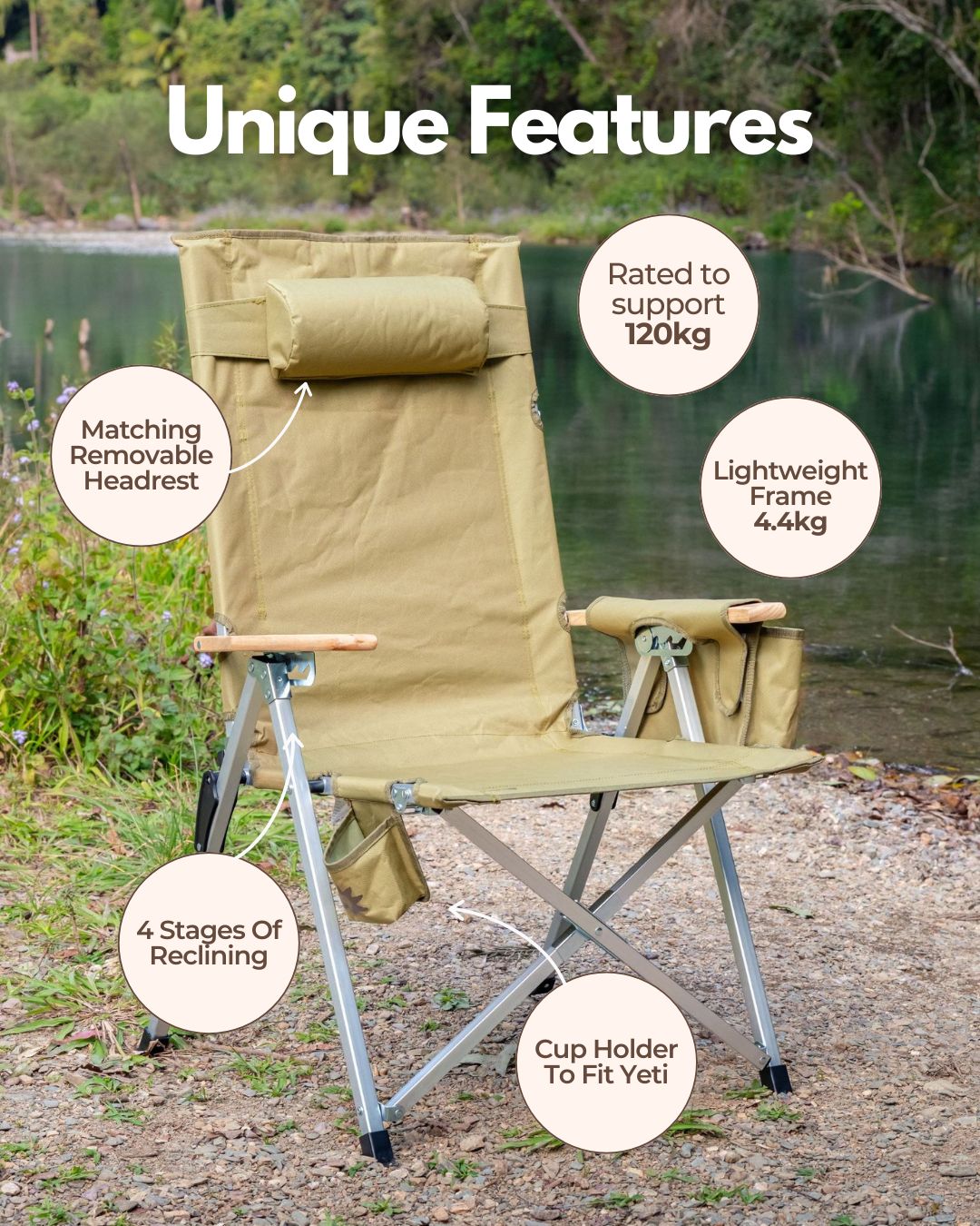 - Lightweight Aluminium Frame: Easy to carry and transport, making them perfect for all your adventures. Supports a maximum weight of 120kg.