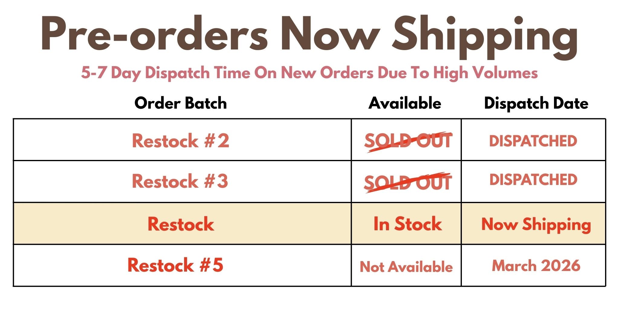 Due to high order volume allow 5 -7 day dispatch