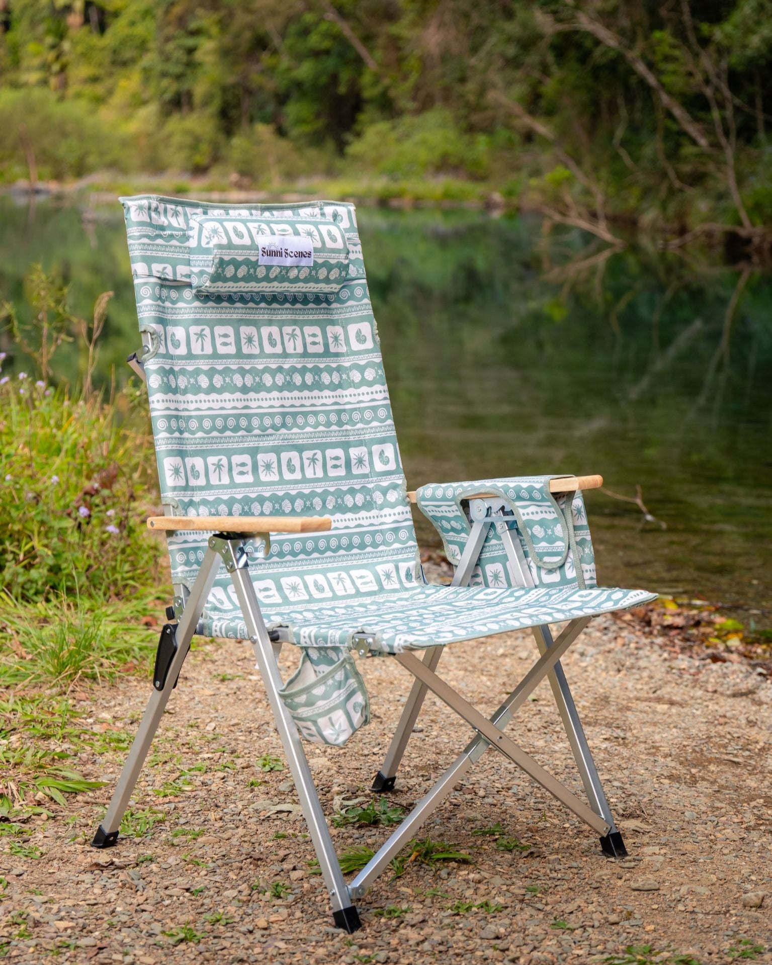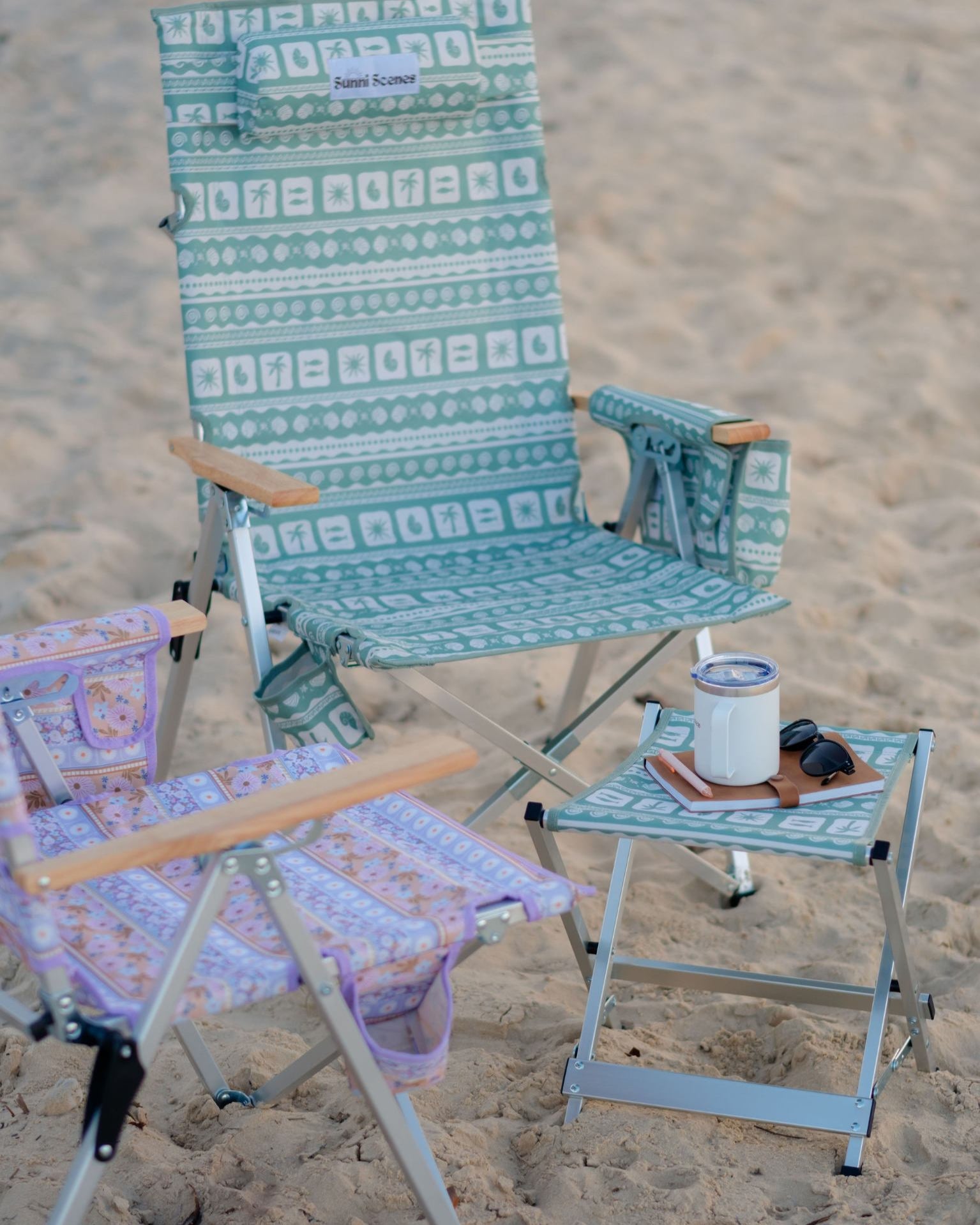 Unique Sunni Scenes prints, Four stage reclining, Removable matching head rest, Compact quad fold pack up design, Generously sized cup holder & Quick dry material.